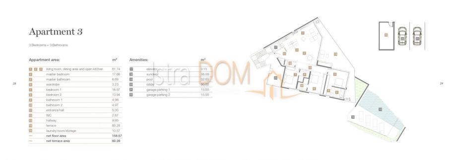 Privatna podzemna garaža i spremišta za svaki stan omogućuju praktičnost i sigurnost, dok lift koji povezuje stanove s garažom olakšava pristup. Elegantni bazen s sunčalištem u okućnici dodatno naglašava atraktivnost kompleksa, čineći ga savršenim mjestom za opuštanje nakon napornog dana ili za uživanje u sunčanim danima. Ovakav prostor svakako privlači one koji traže kvalitetan životni stil u kombinaciji s modernim sadržajima.