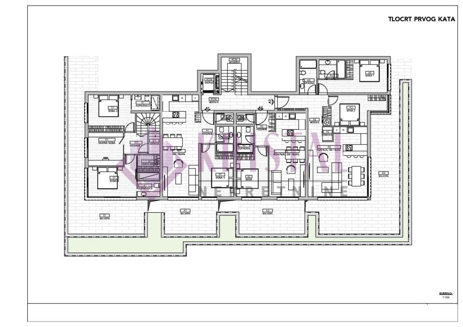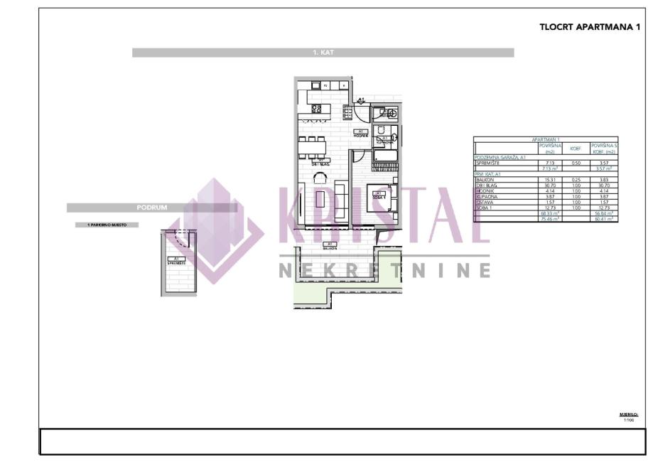 Ekskluzivan apartman oznake A1, 1S+DB, nalazi se na 1.katu, ukupne prodajne netto površine 70.46 m2 (stambeno 52.69 m2).