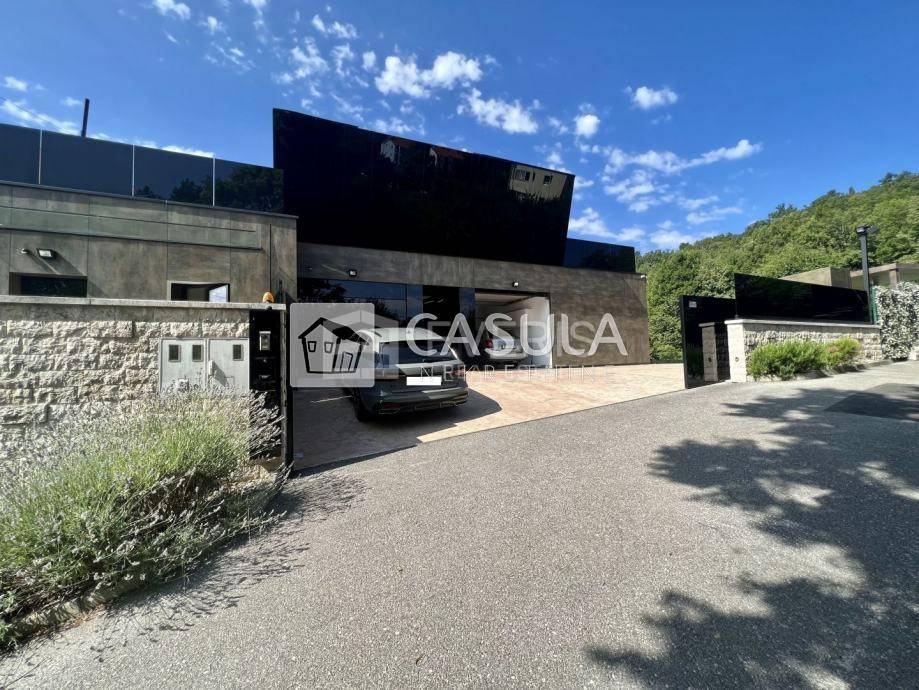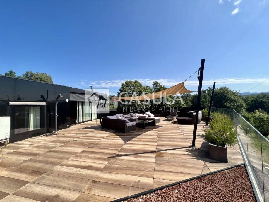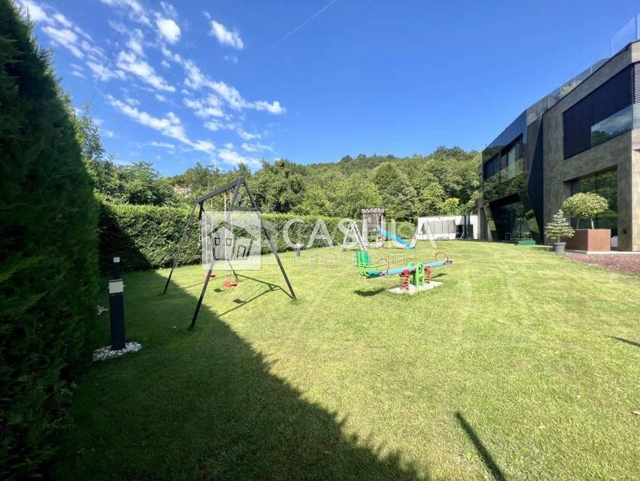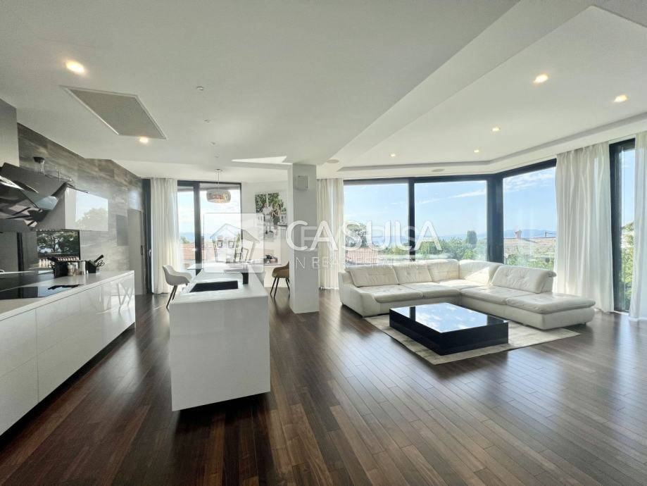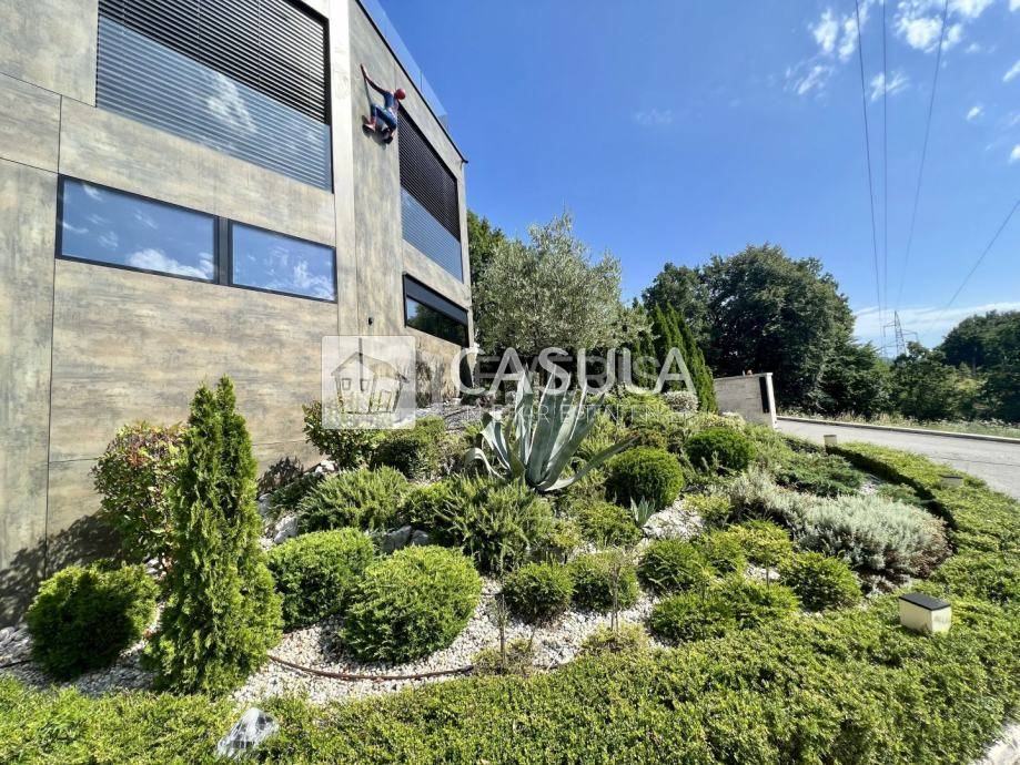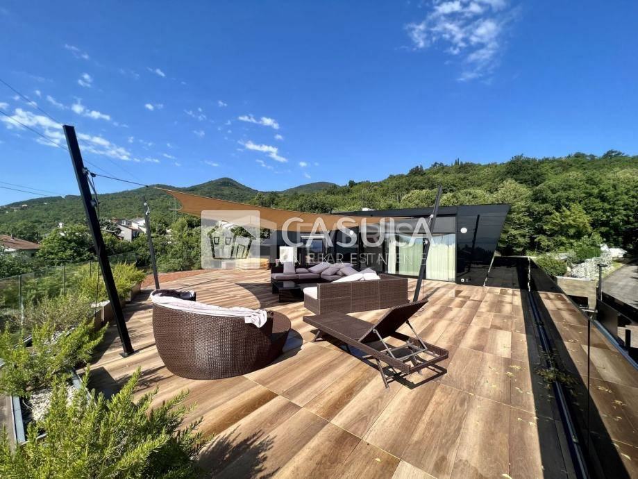 OPATIJA, MATULJI, ekskluzivna vila moderne arhitekture sa panoramskim pogledom na more. Nalazi se na mirnoj i sunčanoj lokaciji, okružena zelenilom, samo 1300 m udaljena od Matulja i 3,5 km udaljena od Opatije. Kuća je dvojna ali potpuno odvojena od drugog dijela što daje osjećaj potpune privatnosti.