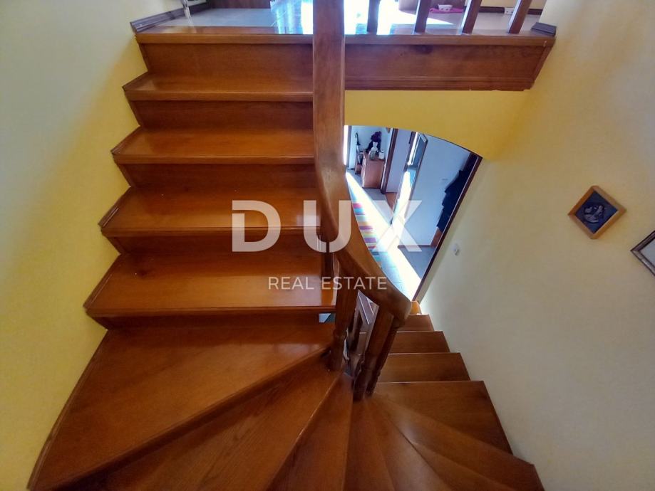 Ručno rađenim drvenim stepenicama dolazimo na kat. Ovdje se nalazi prekrasna velika natkrivena terasa s pogledom na more i okolinu, garderoba, kupaona i dvije spavaće sobe od kojih jedna ima izlaz na balkon.