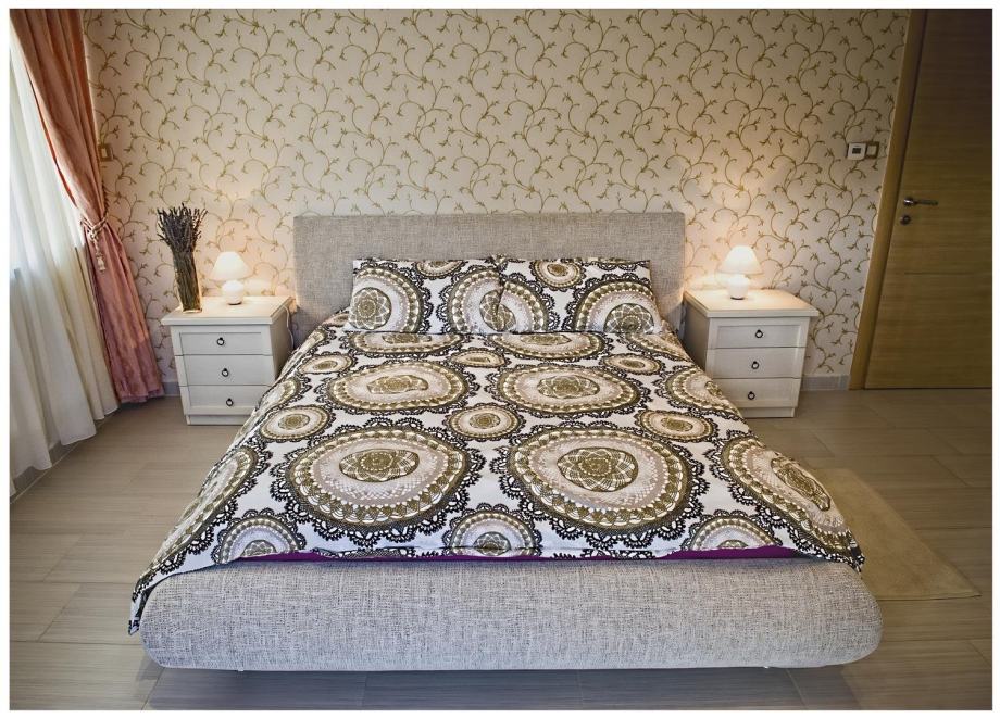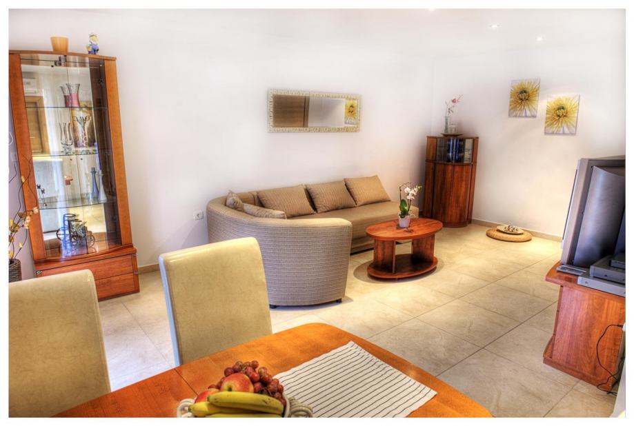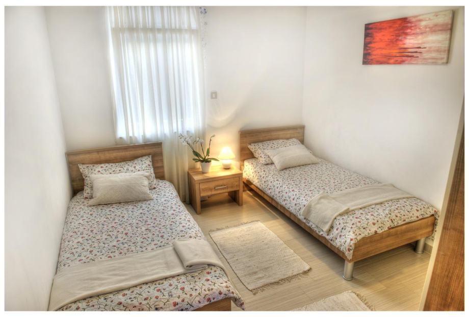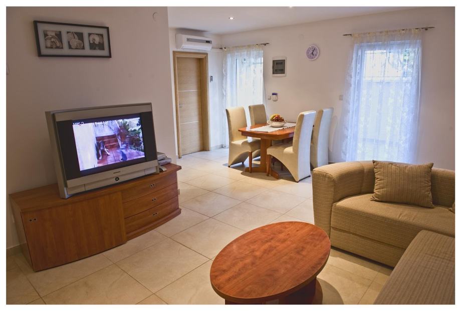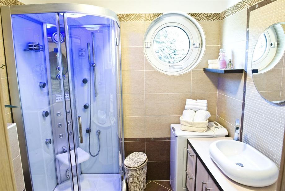 U suterenu se nalazi garaža (170 m2) sa stolnim nogometom,stolnim tenisom i bilijarom, iz koje je direktan ulaz u Villu. U drugom dijelu suterena nalazi se apartman (sa zajedničkim ulazom) koji se sastoji od spavaće sobe (krevet 140x200 cm) i od dnevnog boravka (garnitura na razvlačanje za dvije osobe) i kupaonica sa perilicom rublja. Stubištem se dolazi u predsoblje, iz kojeg je ulaz u otvoreni dnevni boravak/blagovaonicu/kuhinju, okruženu staklenim stijenama. Dnevni boravak je opremljen kaminom, kutnom garniturom, satelitskom televizijom. U sklopu dnevnog boravka nalazi se i kuhinja (sa perilicom suđa, hladnjakom s ledomatom, pećnicom i štednjakom), te blagovaonica za 10 osoba. U prizemlju se nalazi i gostinjski wc. Na prvom katu nalaze se tri spavaće sobe. Prva soba ima ima krevet veličine 160x200 cm, te je opremljena LCD TV-om, u sklopu nje se nalazi i en-suite kupaonica sa hidromasažnim tušem sa parnom kupelji i kromoterapijom, te odvojen garderobni prostor, soba je čitavom dužinom okružena terasom (45 m2). Druga soba ima dva kreveta veličine 90x200 cm, također ima izlaz na terasu, dok treća soba ima krevet 160x200 cm, dijele zajedničku kupaonicu opremljenu hidromasažnom kadom.