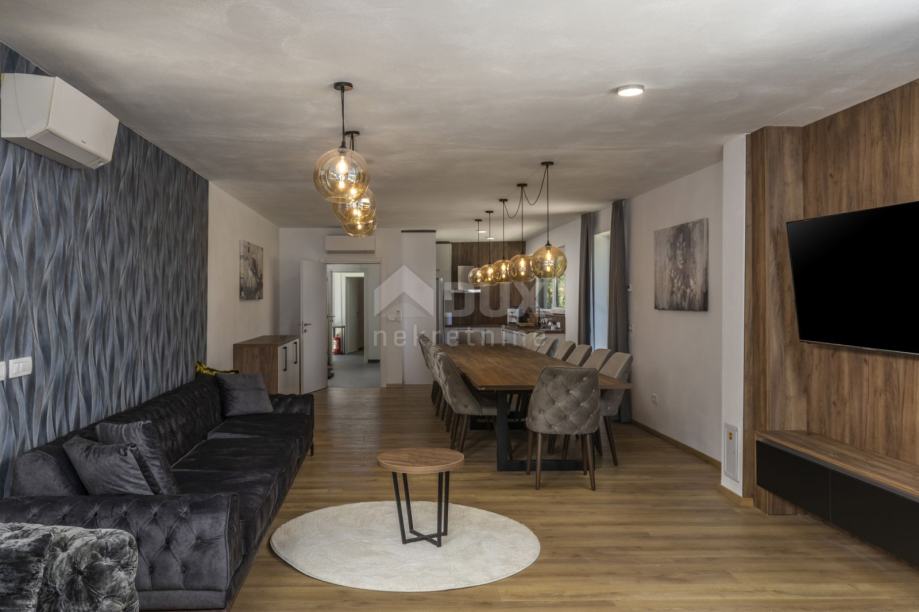 Koncept open space dnevnog boravka važan je dio ove prekrasne kuće. Sa svih južnih prozora i staklenih stijena pruža se pogled na more i zelenilo Kvarnera.
