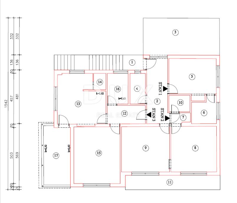 Etaža kuće nalazi se na prvom katu kuće sa sveukupno 3 stana, od čega su susjedi u prizemlju. Kat se sastoji od ulaza, zasebne terase kod ulaza, većeg hodnika koji predstavlja predvorje za 3 apartmana (pogledaj tlocrt) te spomenuta 3 apartmana.