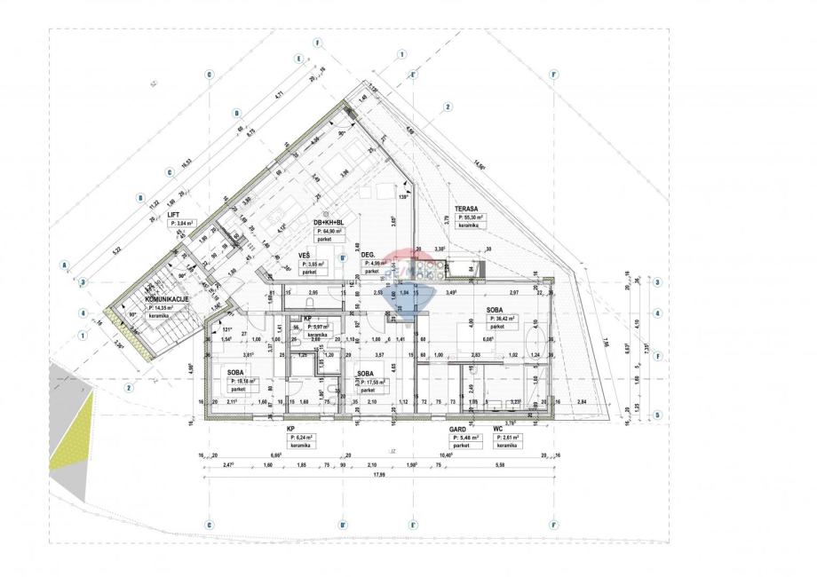 Neto površine 177.16 m2 + terasa 62.58 m2 što čini sveukupno 239.74 m2.
