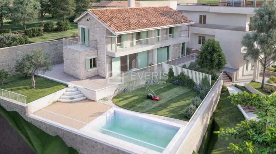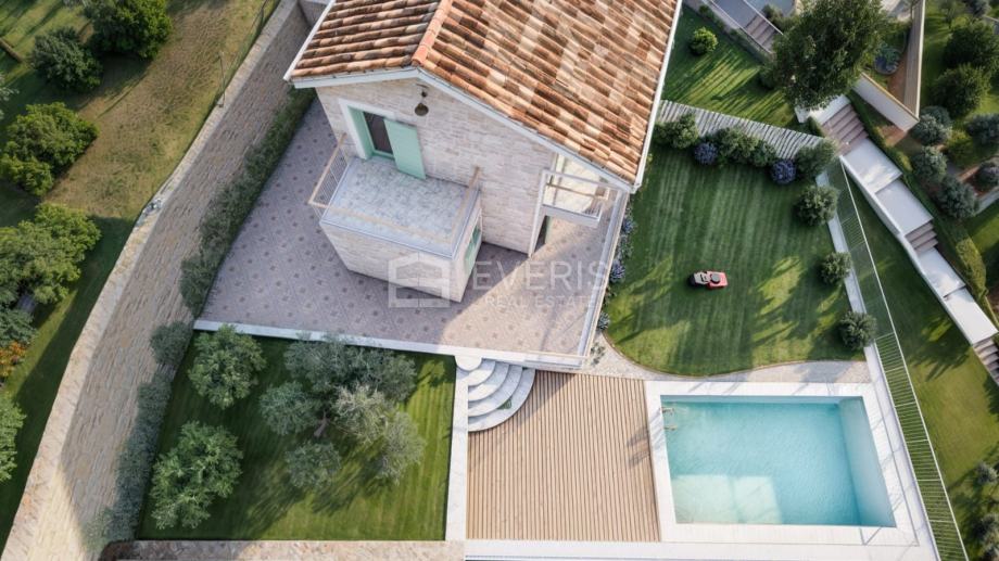 Okućnica kuće je uređena te se na njoj nalazi bazen veličine 3x5m s kojeg se pruža prekrasan pogled na more. Osim bazena, kuća ima i vrt od 80 m2.