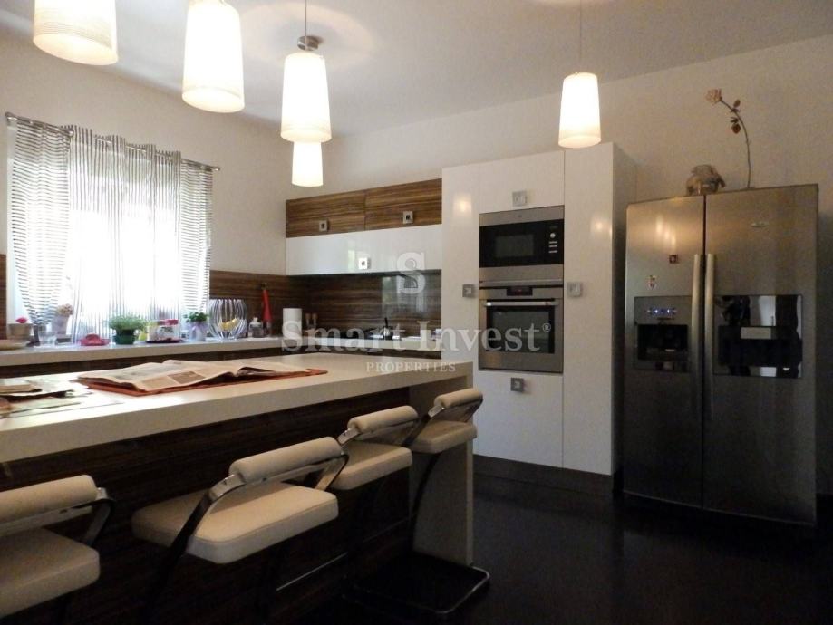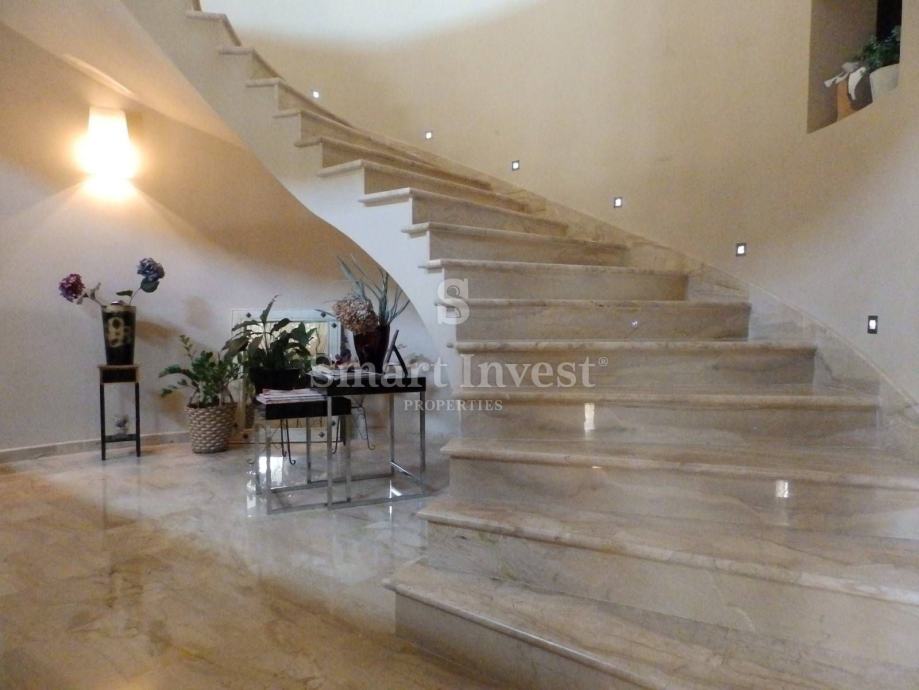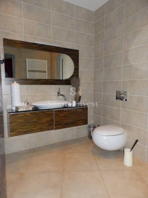 Na katu se nalaze dvije prostrane spavaće sobe, svaka sa svojom garderobom, kupaonicom i izlazom na veliku terasu s pogledom na more. U prizemlju su smješteni dnevni boravak s blagovaonicom i kuhinjom, radna soba, gostinjski WC, soba za goste te utility prostorija. Etaže povezuje elegantno centralno stubište. Stan je potpuno opremljen i spreman za useljenje.