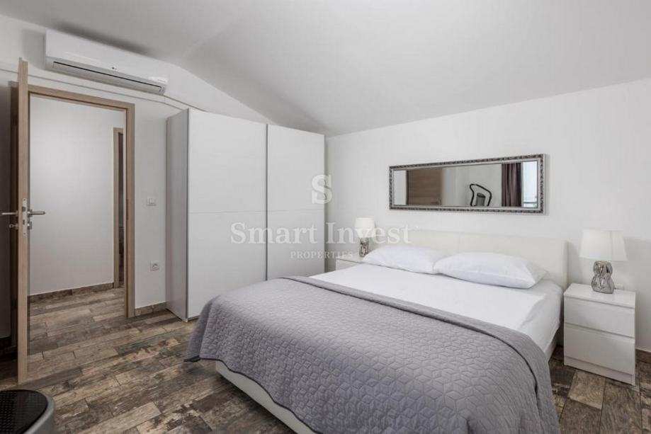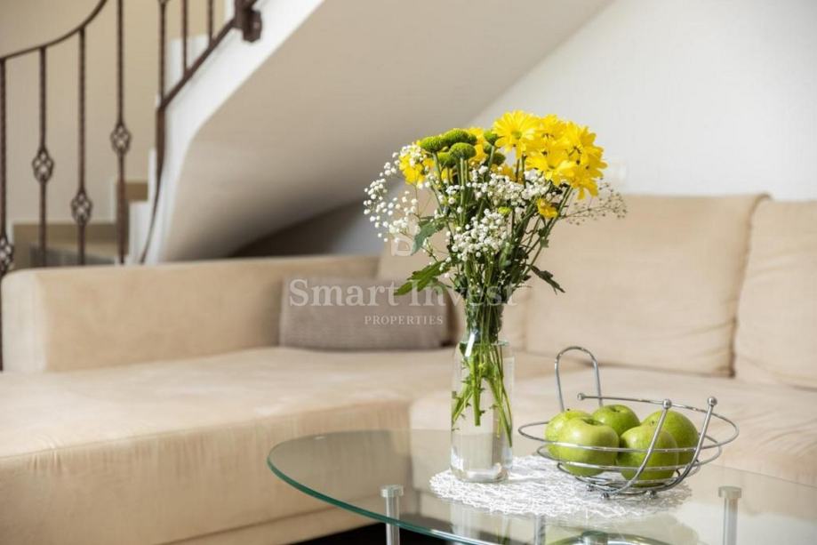 U prizemlju se nalazi otvoreni dnevni boravak s kuhinjom i blagovaonicom, te odvojeni WC za goste. Na katu su smještene dvije spavaće sobe, svaka s vlastitim balkonom i prekrasnim pogledom na more, te kupaonica.