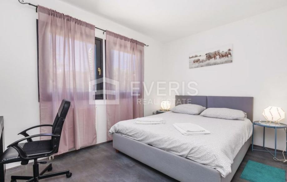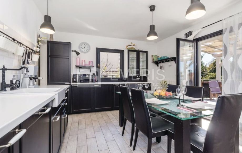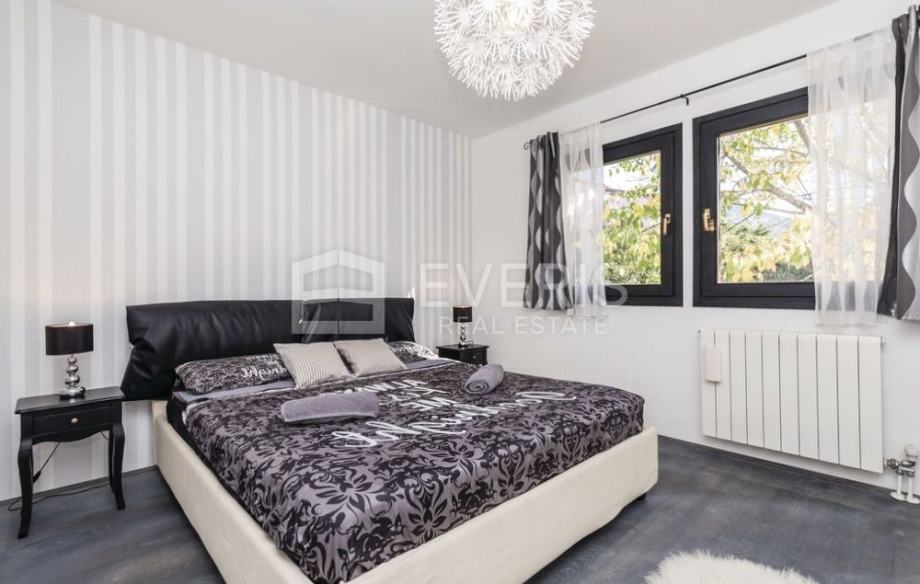 * četiri spavaće sobe, dnevnog boravka, kuhinje, dvije kupaonice, izbe, radne sobe i terase od oko 15 m2 te garaže od 33 m2.