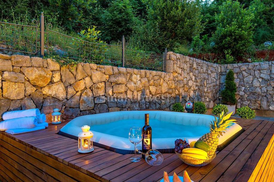 Okućnica je prekrasno uređena i zasađena lovor višnjama, borovima, čempresima i ostalim mediteranskim biljem, a sve zatvoreno u visoke kamene zidove, što daje dojam pravog gospodskog posjeda. Unutar okućnice smješten je okrugli bazen sa sunćalištem, vanjski Jacuzzi za 6 osoba, te parkirni prostor za više automobila.