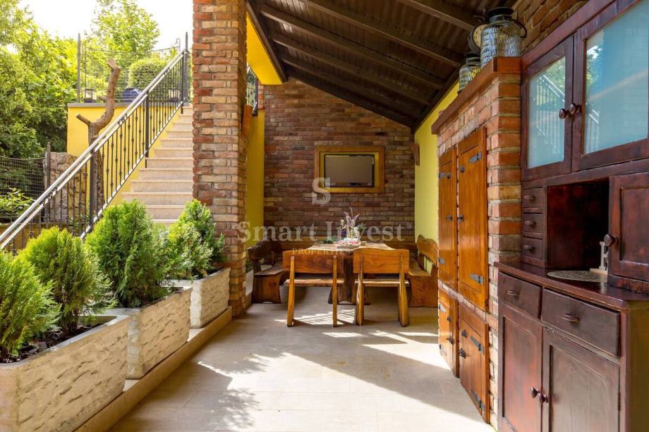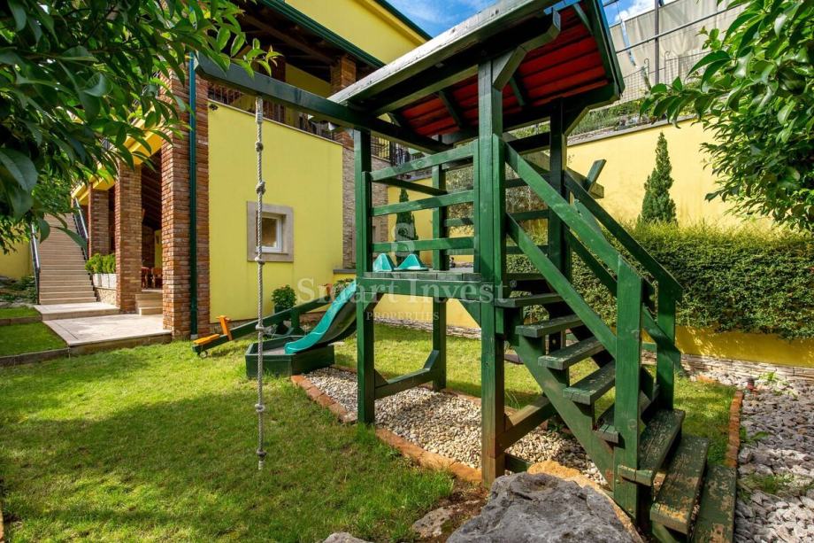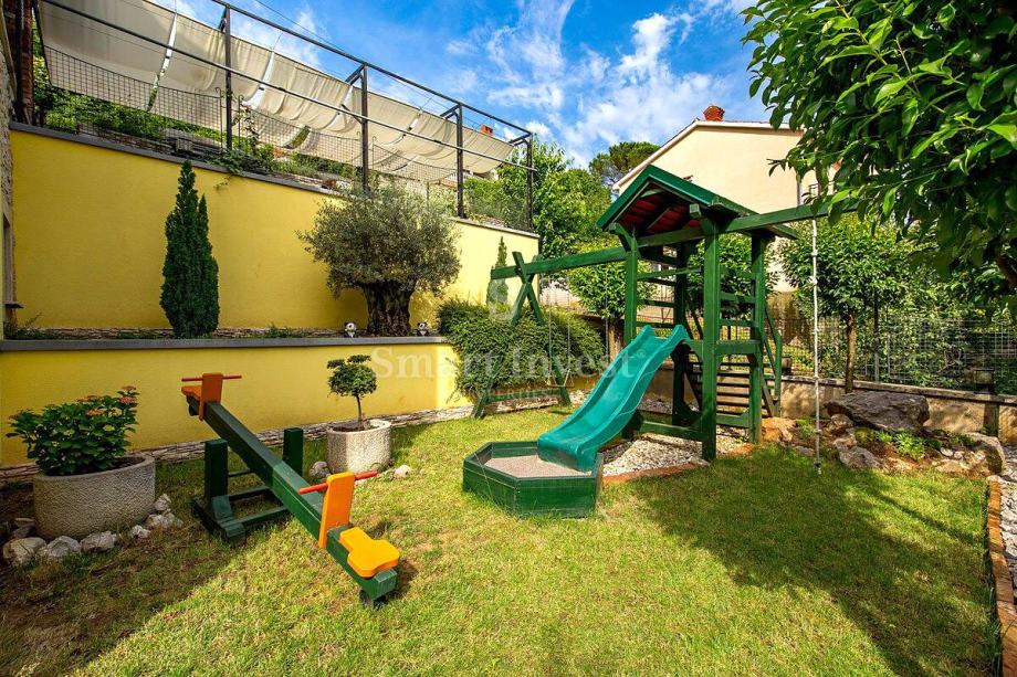 U suterenu se nalazi velika konoba za druženje s prostranom natkrivenom terasom, kupaonica, prostorija pripremljena za vinoteku s odvojenim ulazom s okućnice, veće spremište. Ovdje je i ljetna kuhinja s vanjskim kaminom, kao i predivna igraonica za djecu, uređeni travnjak s toboganom i ljuljačkama.