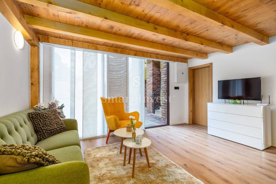 U prizemlju se nalazi stan koji se sastoji od raskošnog dnevnog boravka, kuhinje s blagovaonicom, 2 spavaće sobe, kupaonice te velike terase s izlazom na okućnicu i prema bazenu.