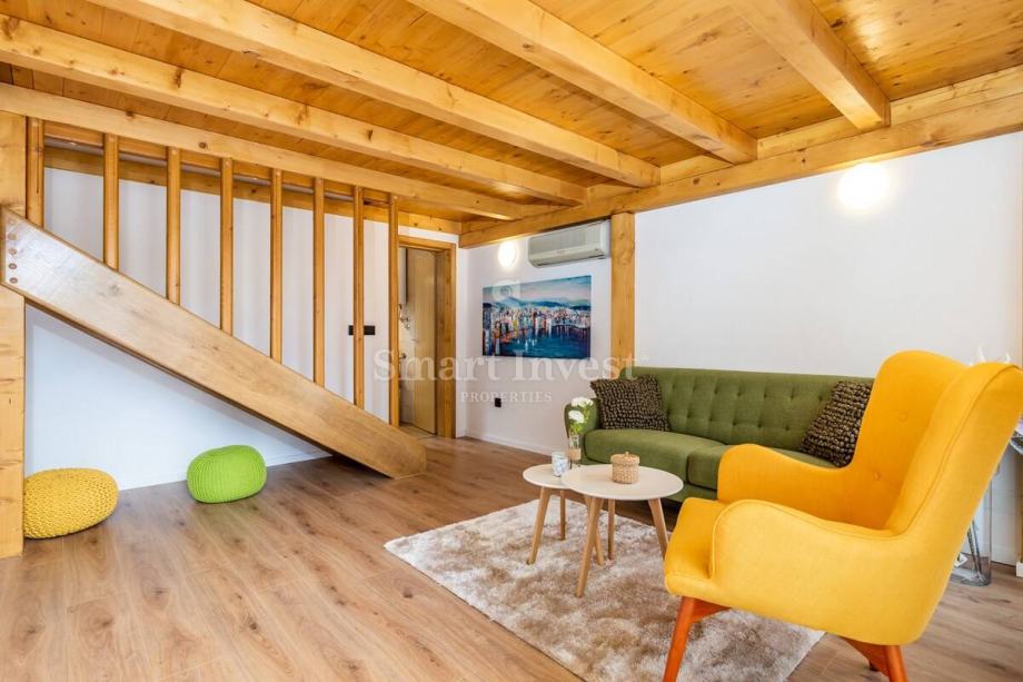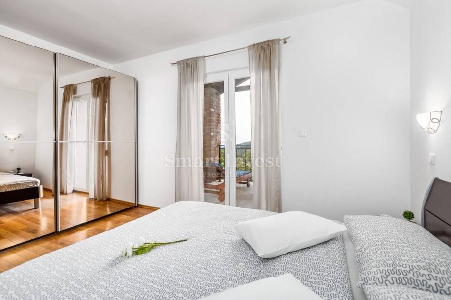 Na 1. i 2. katu se nalazi veliki dvoetažni stan koji se sastoji od prostranog dnevnog boravka s kuhinjom i blagovaonicom, 4 spavaće sobe, 2 kupaonice, WC, te dvije terase i dva balkona s predivnim pogledom na more i okolno zelenilo.