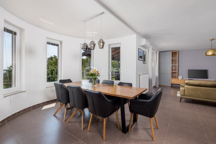 Nekretnina ima 5 spavaćih soba, 2 kupaonice, dnevni boravak s blagovaonom i kuhinjom u otvorenom prostoru. U podrumu ćete pronaći saunu i fitness sobu, dok je jedna kupaonica opremljena jacuzzijem.