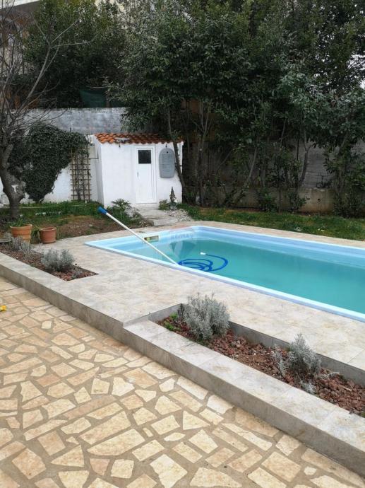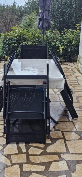 Etaži pripada 3 parkirna mjesta, te okućnica 1200 m2 s bazenom, pomoćnim objektom (spremištem) i vrtom.