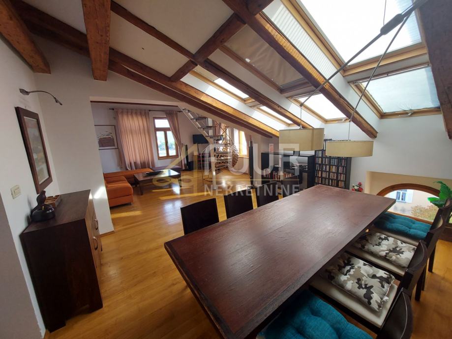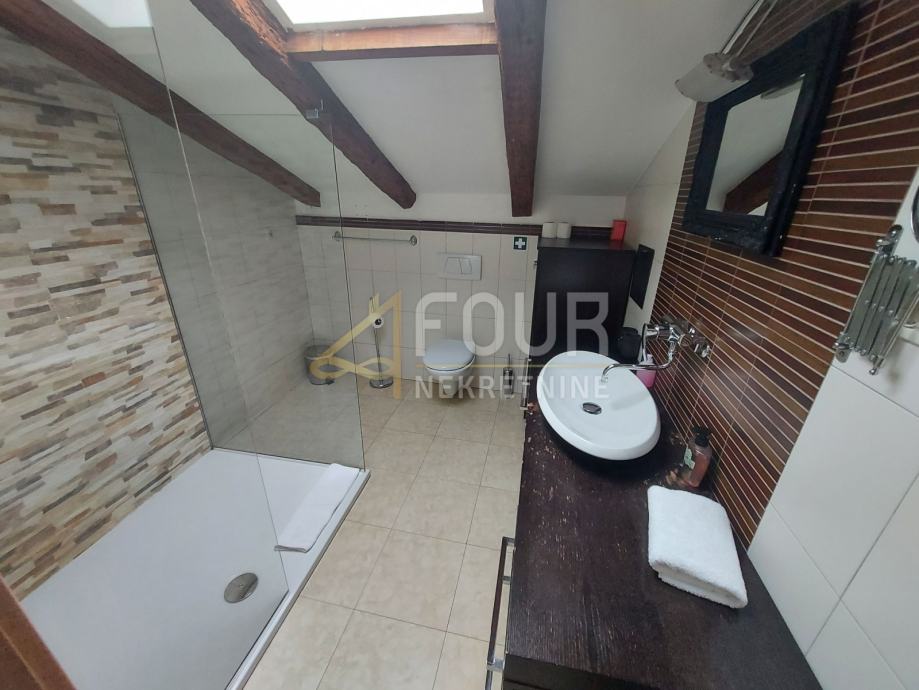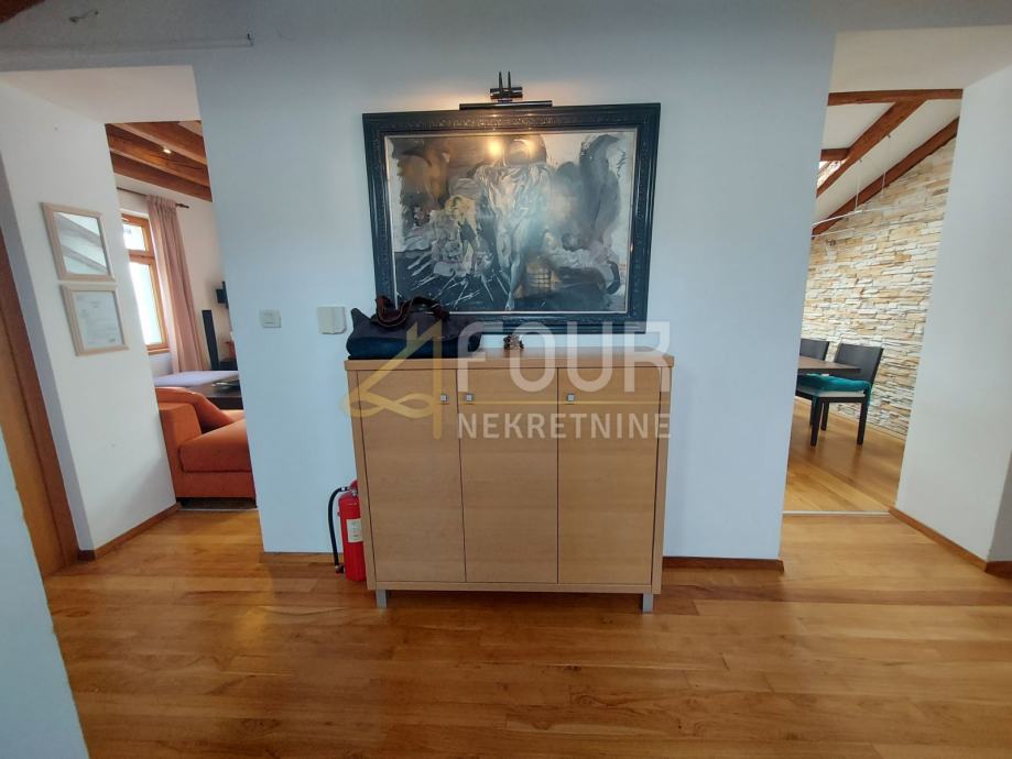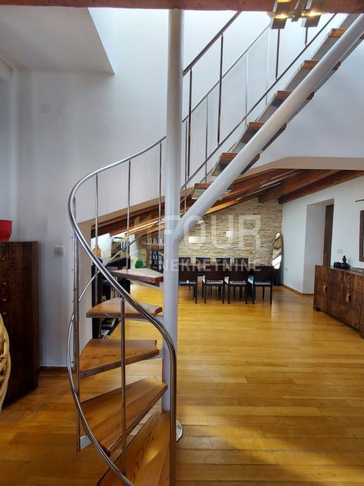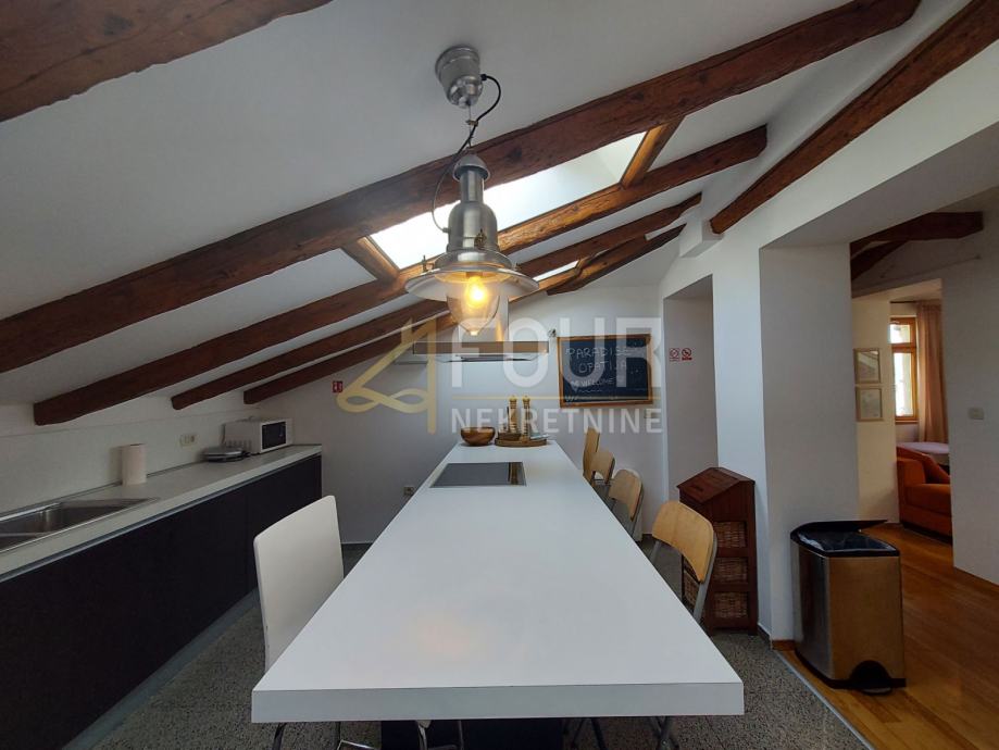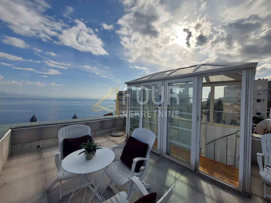 U ponudi imamo vrlo poseban dvosobni stan sa dnevnim boravkom u samom centru Opatije površine 121.93 m2. Stan se nalazi na zadnjem katu (penthouse) sa svojom terasom površine 10 m2 i predivnim pogledom na more. Jedan dio stana (dnevni boravak) je normalne visine, a drugi dijelovi stan su na kosinama.