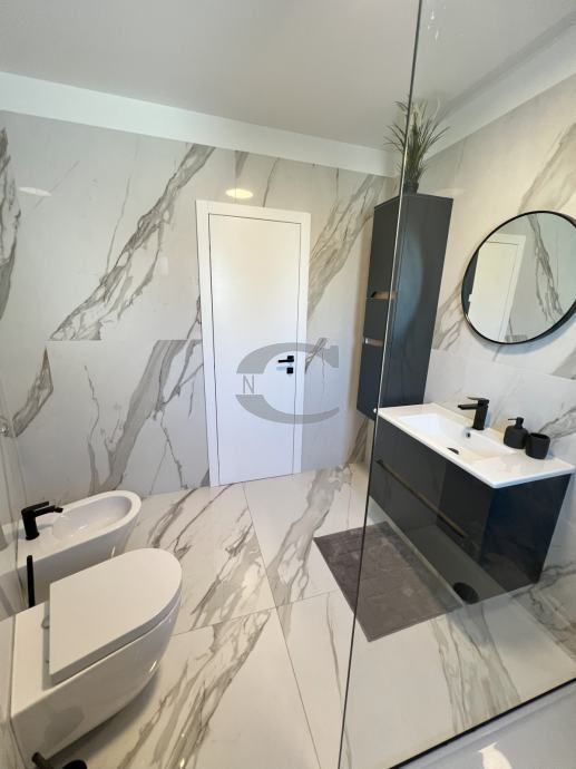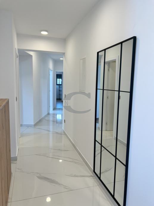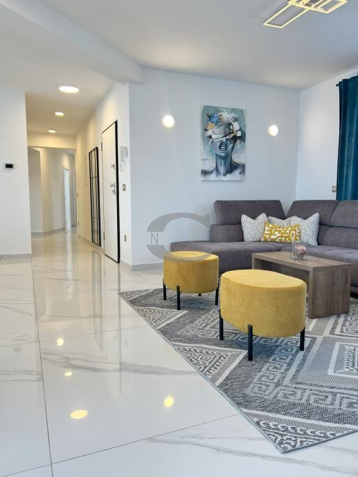 Stan u centru Pobri, na prvom katu koji ima djelomičan pogled na more. Stan se sastoji od WC-a, dvije kupaonice, tri spavaće sobe, ultility-a, kuhinje s blagavaonicom i dnevnim boravkom te natkrivene terase.