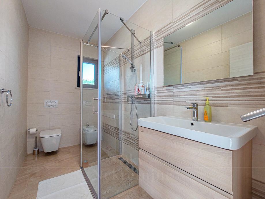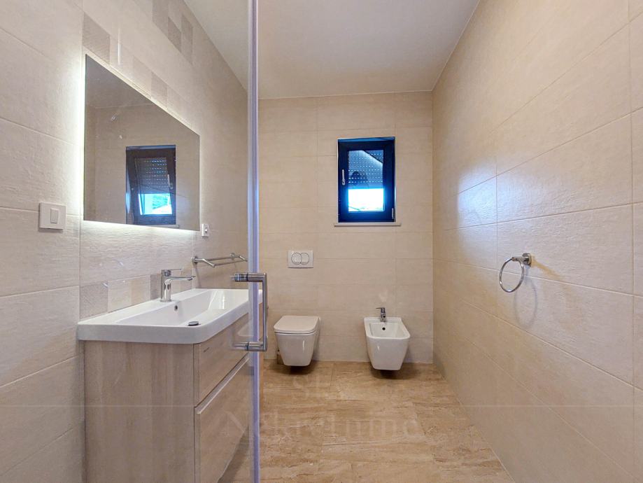 U cijeloj kući je podno grijanje, aluminijska stolarija s kliznim stijenama, protuprovalna vrata, klime, a na podovima su pločice u imitaciji mramora dok su stepenice za prizemlje od mramora iste nijanse.
