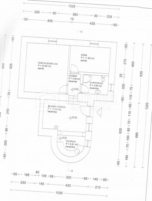 Prva kuća, ukupne površine 103,11 m2 se sastoji od ostave i uređene konobe u suterenu površine 36,38 m2, te kuhinje, blagovaonice, hodnika, velikog dnevnog boravka i spavaće sobe u prizemlju površine 66,73 m2.