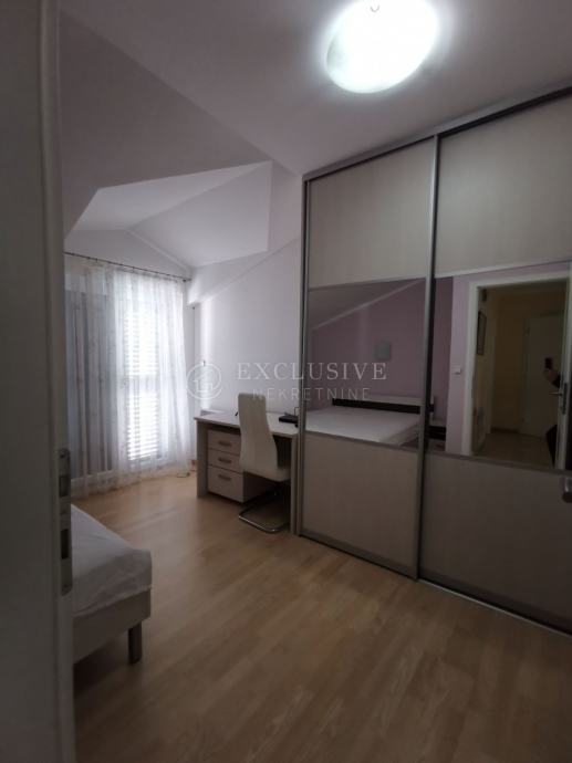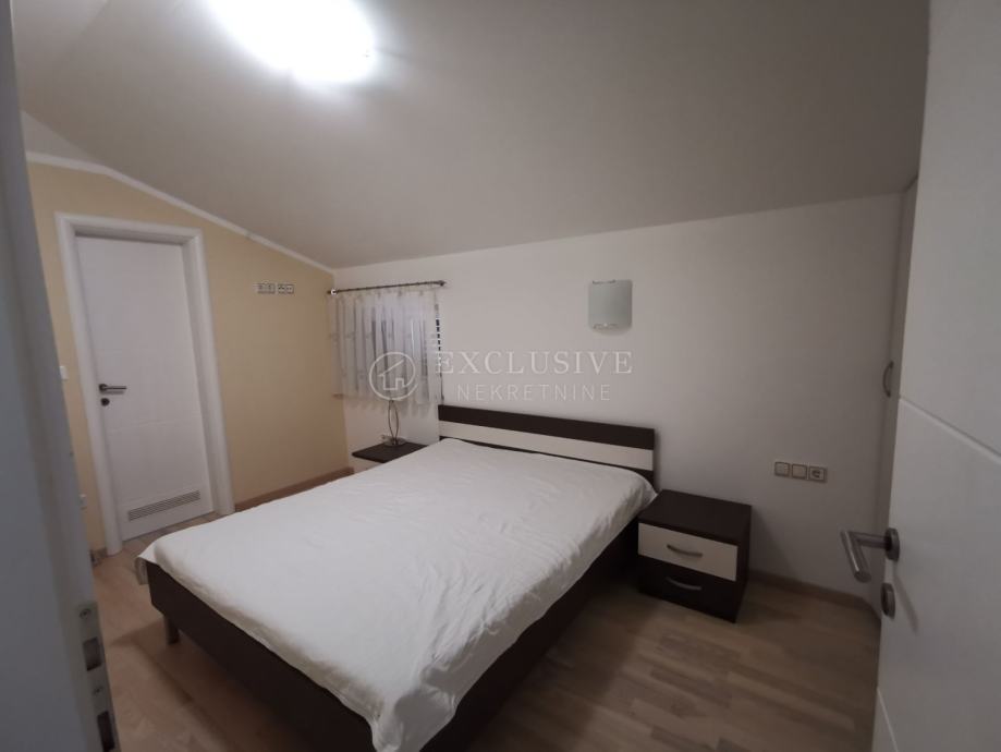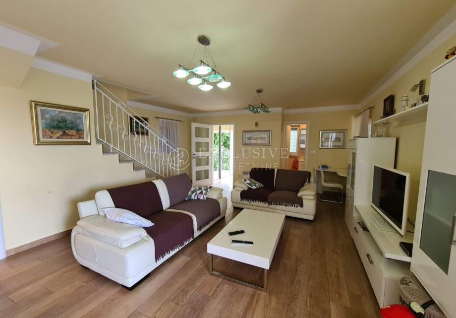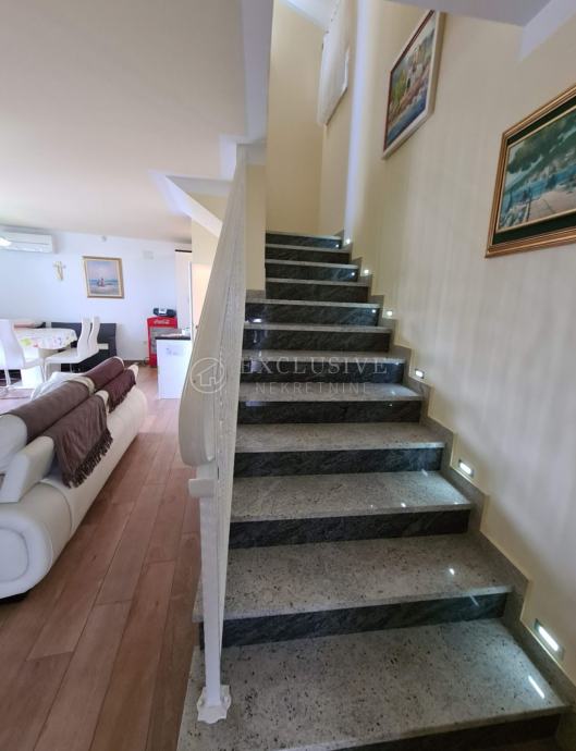 STAN na 1. katu i potkrovlju, koji se sastoji od ulaza, dnevnog boravka, kupaonice, izbe i kuhinje s blagovanjem na 1. katu, stubišta, galerije, tri spavaće sobe i tri kupaonice u potkrovlju ukupne površine 102,90 m2, kojem pripada kao sporedni dio natkrivena terasa na 1. katu površine 16,55 m2 i otvorena terasa u potkrovlju površine 19,60 m2, stubište s podestom u prizemlju površine 7,00 m2, ostava u suterenu površine 2,45 m2, i vanjsko stubište s podestom površine 27,00 m2.