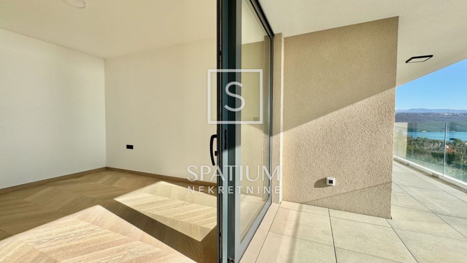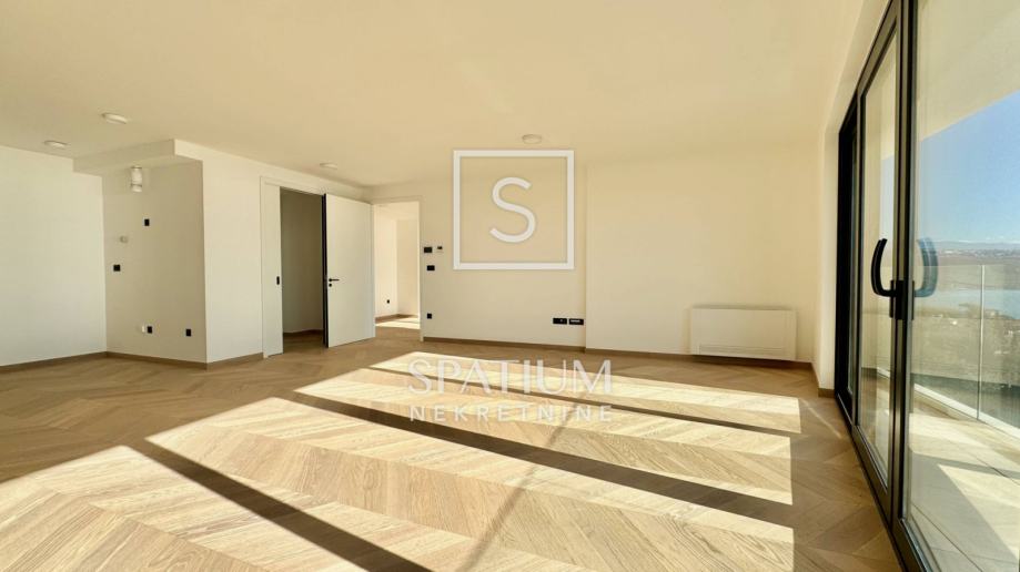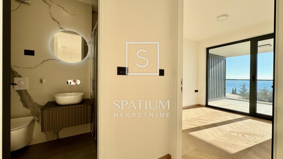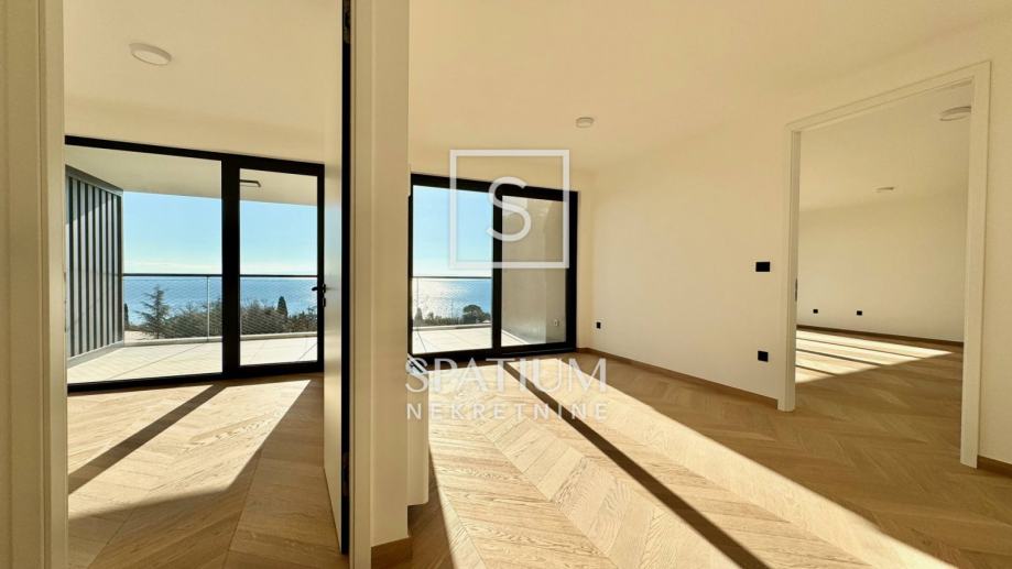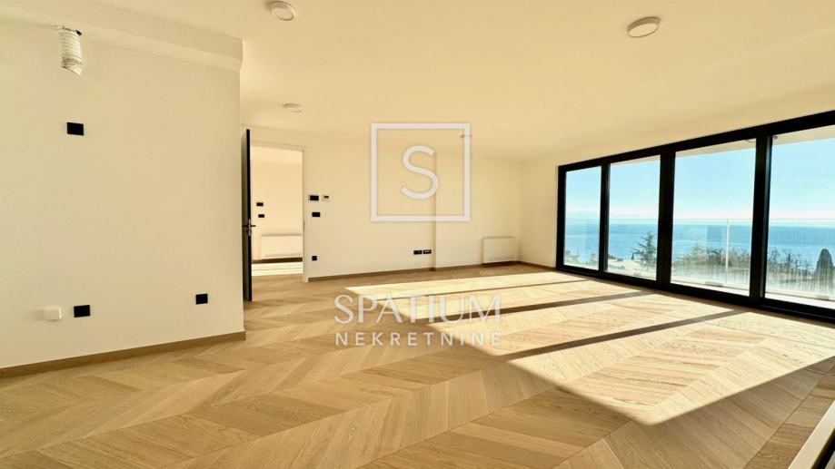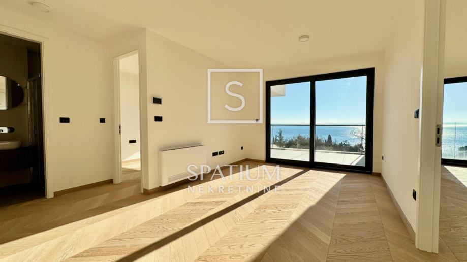 OPATIJA, u ponudi je izuzetno prostrani stan na drugom katu izvrsne novogradnje s liftom na pješačkoj udaljenosti od prve plaže i centra Opatije. Odličnom prvom dojmu doprinosi predivan Chevron parket koji krasi većinu stana i u kombinaciji s prirodnim svjetlom stvara topli komforni ugođaj. Središnja prostorija površine 43 metara kvadratnih prava je definicija otvorenog koncepta namijenjenog dnevnom boravku, blagovaonici i kuhinji iz kojih se pruža pogled na more zahvaljujući velikim staklenim stijenama koje ujedno odlikuje odlična zvučna izolacija. Pogled na more ne izostaje iz glavne spavaće sobe koja ima samostalnu garderobu, izlaz na balkon i en-suite kupaonicu. Dodatne dvije spavaće sobe dijele drugu moderno uređenu kupaonicu.