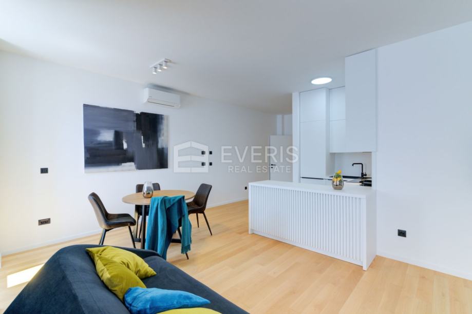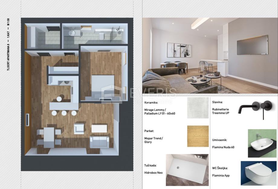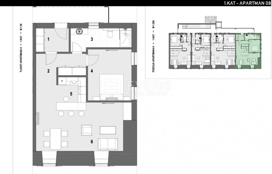 Apartman broj 8. nalazi se na prvom katu resorta, a isti se sastoji od: ulaza, blagovaonice i dnevnog boravka, kuhinje, hodnika i ormara, spavaće sobe i kupaonice površine 67,28 m2.
