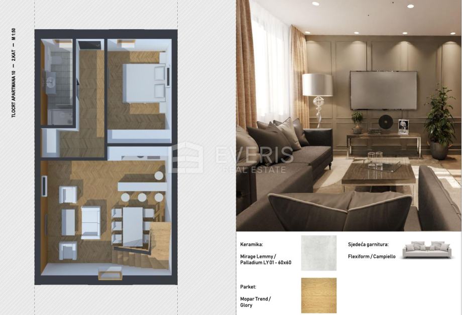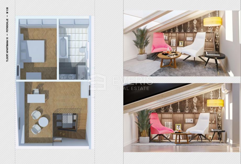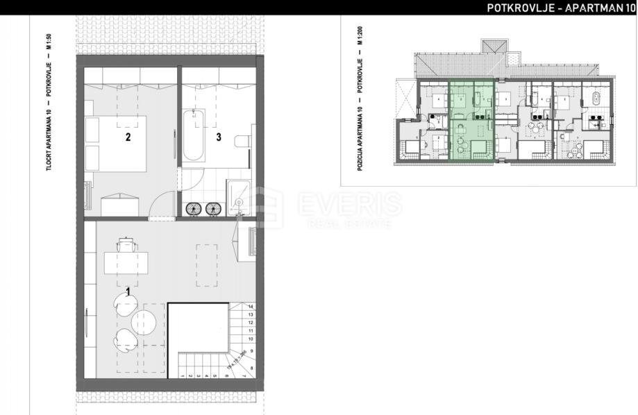 Apartman broj 10. nalazi se na drugom katu i potkrovlju resorta, a isti se sastoji od: ulaza, blagovaonice i dnevnog boravka, kuhinje, hodnika i ormara, spavaće sobe i kupaonice; potkrovlje: spavaća soba, galerija i kupaonica, površine 99,81 m2.