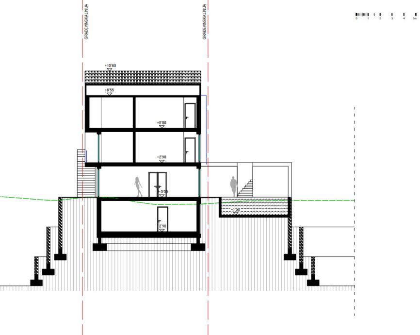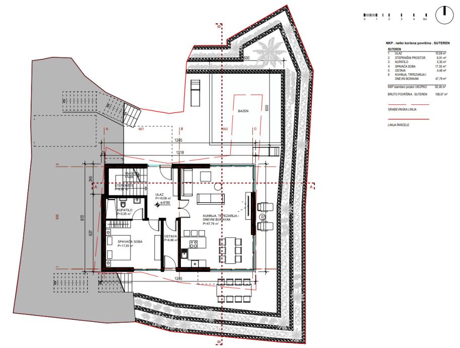Kroz velike otvorene klizne stijene, prostor će obilovati prirodnom svjetlošću, a s terase ili vrta moći ćete uživati u panoramskom pogledu na more. Što se tiče unutarnjeg prostora, kuća će imati 7 spavaćih soba, od kojih će svaka biti uređena s pažnjom prema kvaliteti, a svaka od tih soba imati će i vlastitu kupaonicu. U podrumu će se nalaziti kuglana, unutarnji bazen i wellness s dvije saune i jednim jacuzzijem.