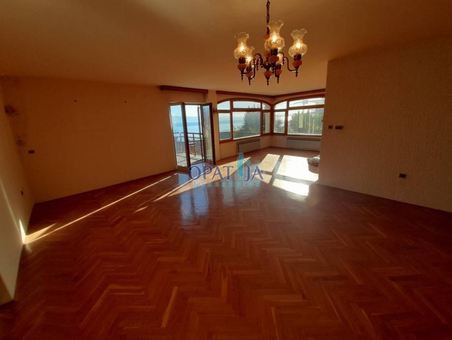 Prizemlje obuhvaća 90 m2, gdje se nalazi kupaonica s odvojenim toaletom, kuhinja, kao i prostrani dnevni boravak koji je orijentiran prema jugu s izlazom na balkon koji ima predivan panoramski pogled na more i Kvarner.