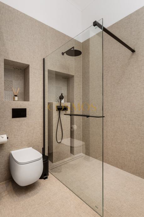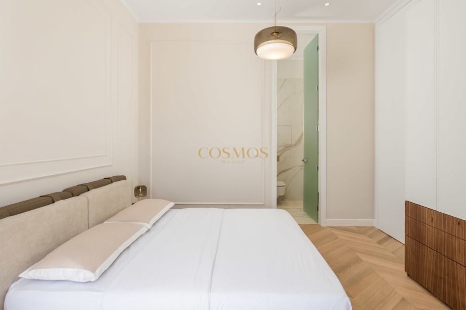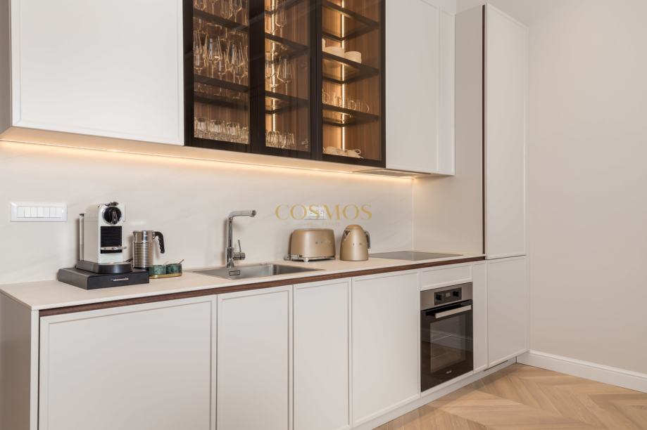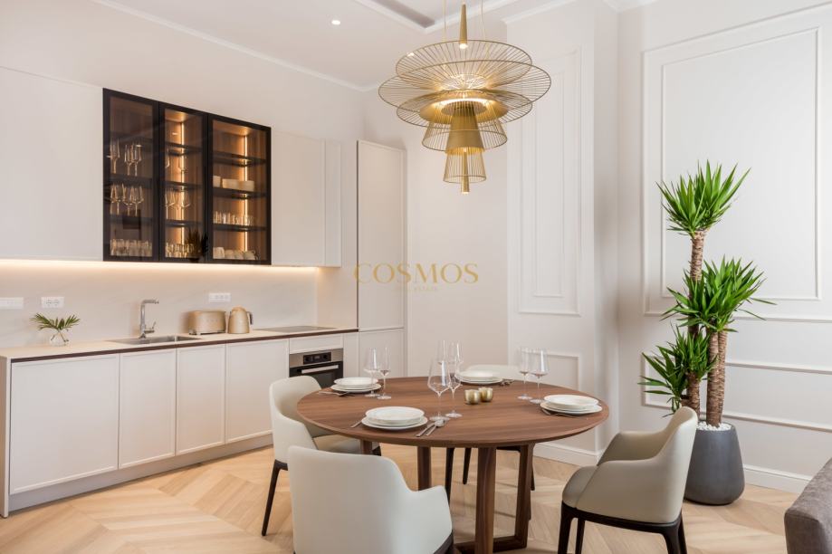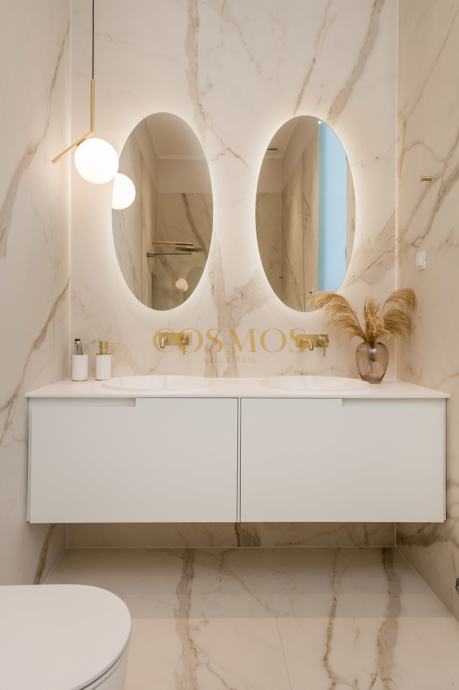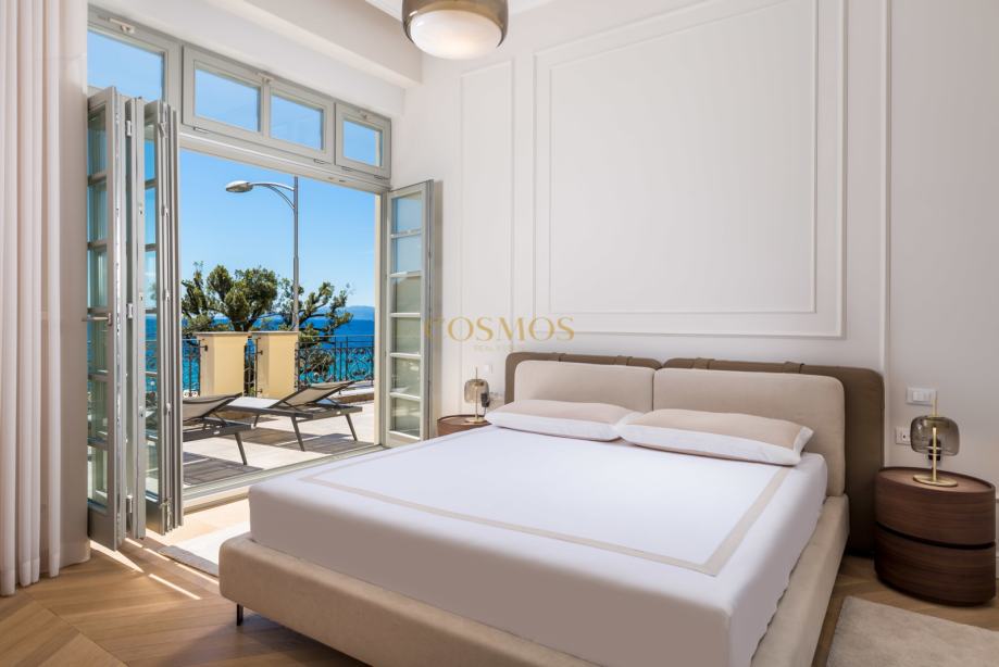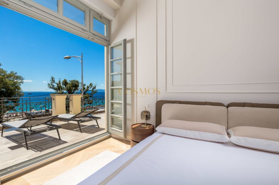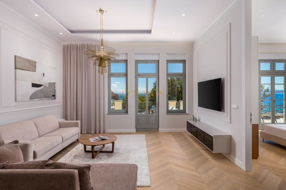 Prodaje se dizajnerski i umjetnički uređeni 2,5-sobni stan u Opatiji, ukupne površine 113,84 m2, smješten na prvom katu ekskluzivne zgrade uz more. Stan se nalazi praktički u prvom redu do mora, pružajući prekrasan pogled sa prostrane terase 34,66 m2 i izravan pristup obali, što ga čini savršenim za one koji traže luksuzan životni prostor na atraktivnoj lokaciji.