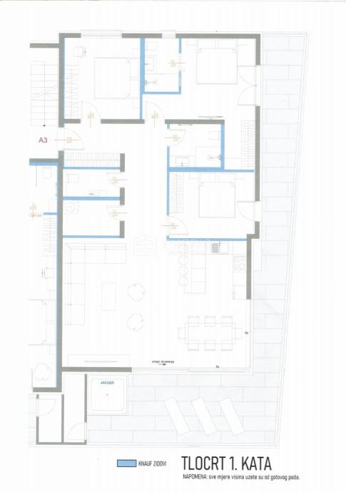 ▪ hodnik, toalet, ostava, dvije kupaone, kuhinja, blagovaona i dnevni boravak, tri spavaće sobe i dva balkona ukupne površine 144,30 m2.