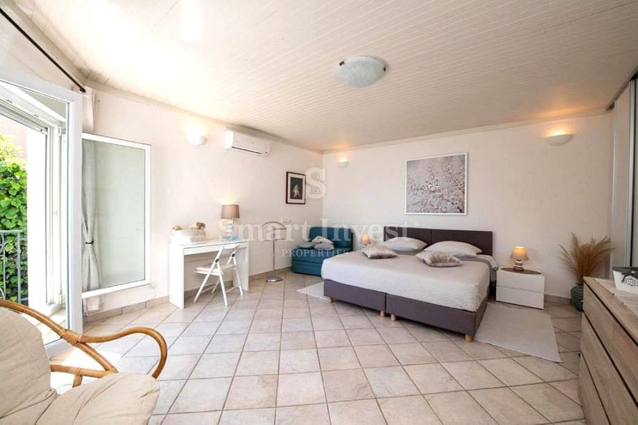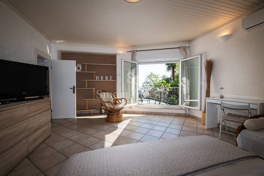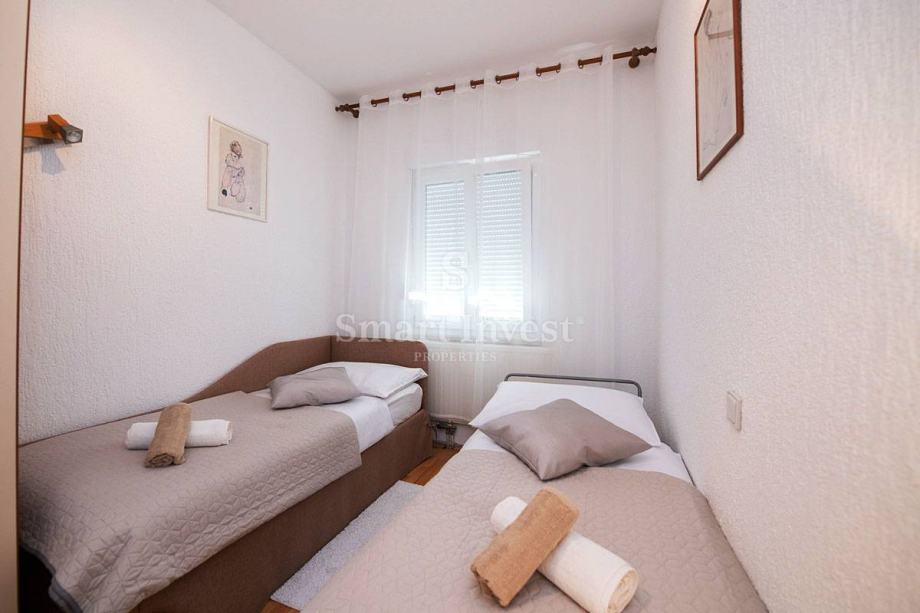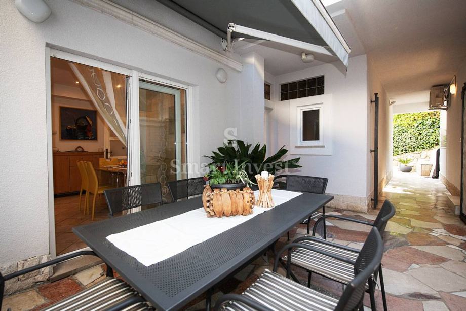 Stan se nalazi na 1. katu lijepe vile te se sastoji od hodnika, dnevnog boravka sa izlazom na prostrani balkon s predivnim pogledom na more, kuhinje s blagovaonom s izlazom na još jedan balkon na južnoj strani te natkrivenu verandu na sjevernoj strani, tri spavaće sobe, tri kupaonice, ostave. Stan ima zaseban ulaz te prostranu nenatkrivenu terasu.
