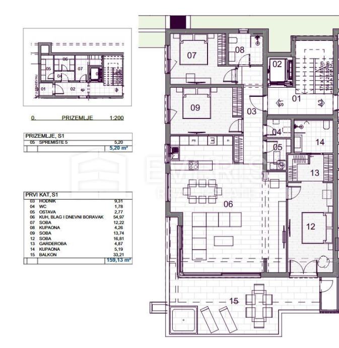 ▪ hodnik (9,31 m2), toalet (1,78 m2), ostava (2,77 m2), dvije kupaone (9,45 m2), garderoba (4,87 m2), kuhinja, blagovaona i dnevni boravak (54,97 m2), tri spavaće sobe (42,77 m2), i balkona (33,21 m2) ukupne površine 159,13 m2.