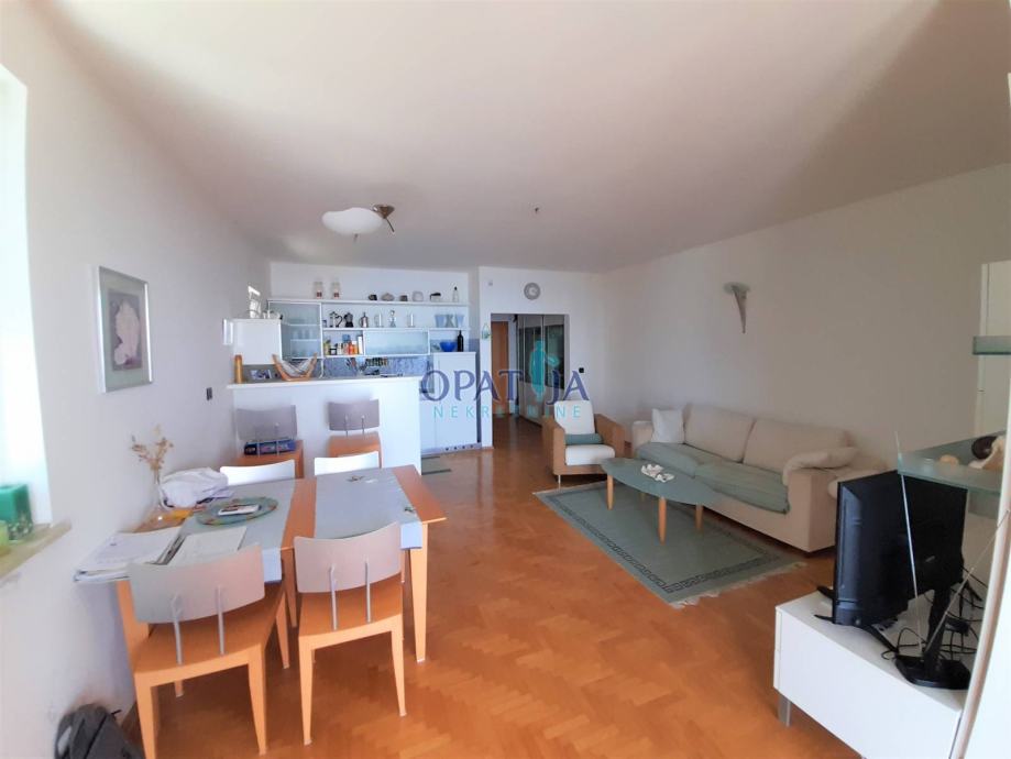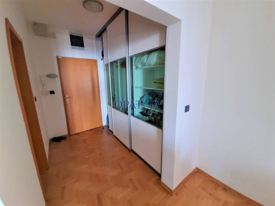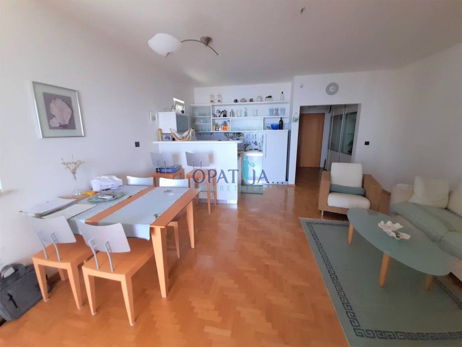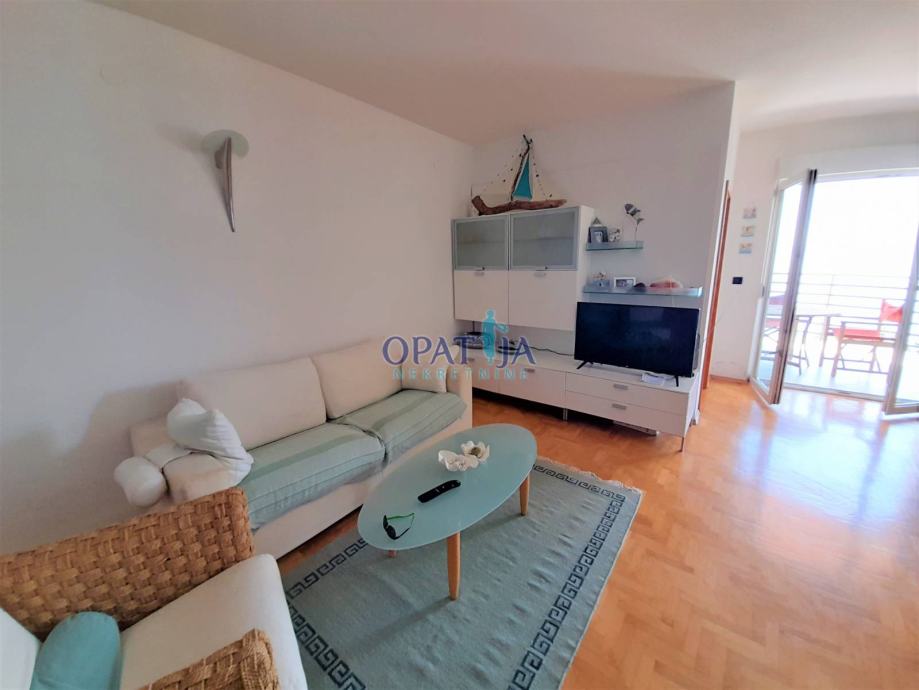 Odličan apartman sa panoramskim pogledom nedaleko opatijske šetnice i plaža, ukupne stambene površine 46.69 m2, a koji se sastoji od kuhinje i dnevnog boravka s izlaskom na prekrasnu veću natkrivenu loggiu sa pogledom na Kvarner i otoke, odvojene spavaće sobe i kupaonice.