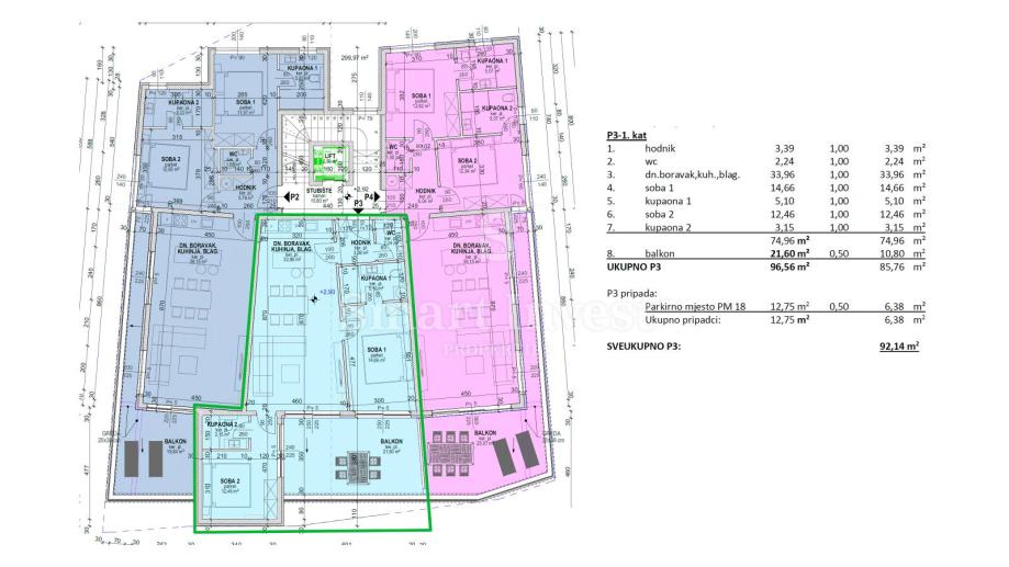 • sveukupna površina stana izražena s koeficijentima: 92,14 m2