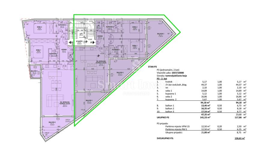 • sveukupna površina stana izražena s koeficijentima: 126,61 m2