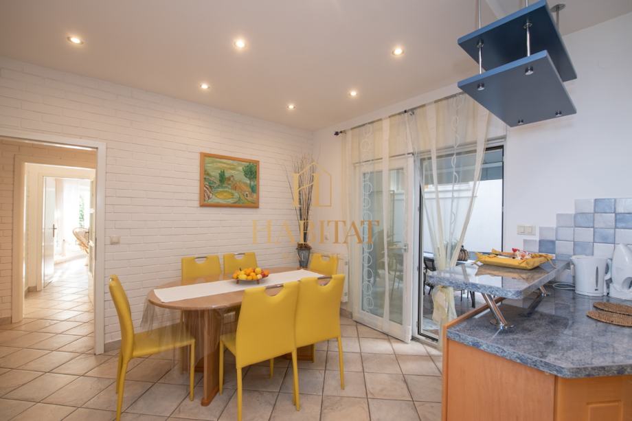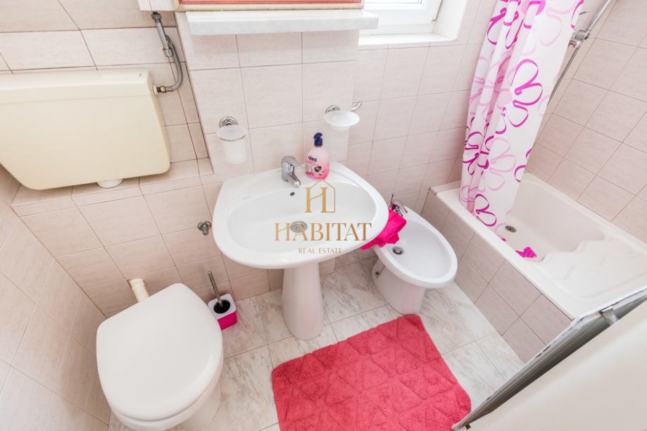 Stan se nalazi na prvom katu obiteljske kuće. Čine ga tri spavaće sobe i tri kupaonice s tuš kabinama, velika kuhinja, ostava te dva balkona i veranda. Jedan balkon nalazi se na izlazu iz dnevnog boravka s veličanstvenim pogledom na more, drugi se nalazi na južnoj strani kuhinje, dok sjeverni izlaz iz kuhinje vodi na natkrivenu verandu. Stan je opremljen klima uređajima u dnevnom boravku i spavaćoj sobi. Parking u vlasništvu.