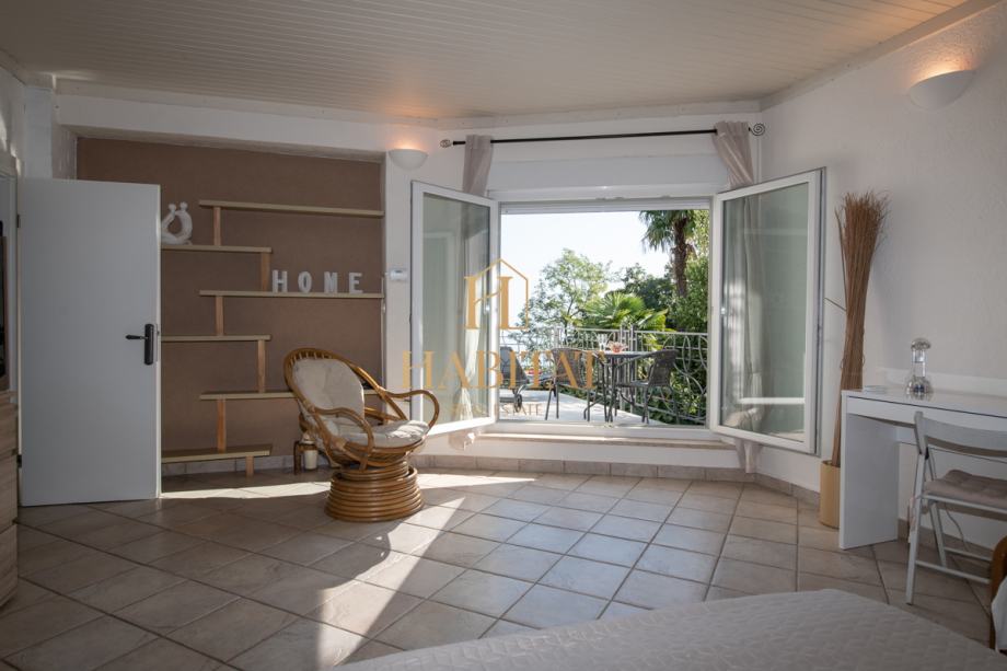 Prodaje se stan s veličanstvenim pogledom na Kvarnerski zaljev. U njegovoj neposrednoj blizini nalaze se: market (20 m), autobusna stanica i obalna šetnica uz more, restorani (100 m), centar Opatije (1,2 km) i noćni klub. Dvije minute šetnje od stana nalazi se plaža s kamenjem i betoniranim platoom , 7 minuta hoda udaljena je uređena šljunčana plaža za pse, dok se na plaži udaljenoj 1 km može iznajmiti pedalina, čamac i vez za čamac. Tenisko igralište nalazi se u blizini od 1,2 km. U krugu od 10 km na prekrasnoj planini Učki možete jahati na ranču konja ili planinariti i uživati u prirodi.