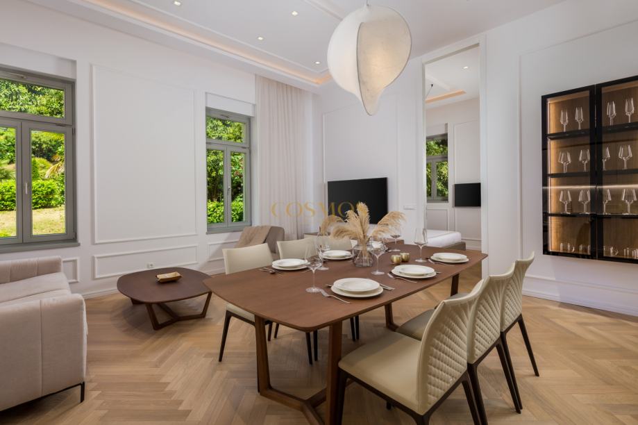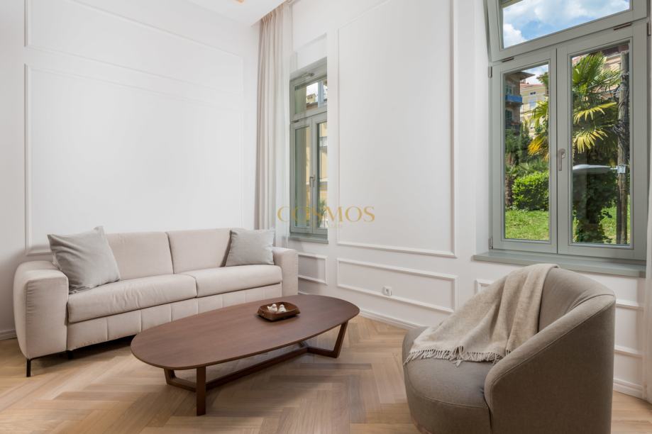 Prodaje se dizajnerski i umjetnički stan, smješten na prvom katu zgrade u Opatiji, ukupne površine 90,36 m2. Ovaj 2,5-sobni stan (2S+DB) nudi luksuzan život uz more, pružajući izvanredan pogled na more iz prve linije.Stan se sastoji od dvije sobe,prostranog dnevnog boravka sa kuhinjom i dvije kupaonice i terase 14,15 m2 sa koje se pruža pogled na more.