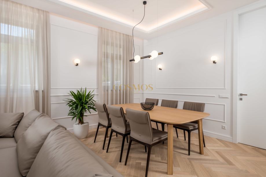 U srcu prekrasne Opatije, smješten je dizajnerski i umjetnički stan s pogledom na more, površine 91,67 m2. Ovaj 2,5-sobni stan (2S+DB) nalazi se na prvom katu zgrade koja je prvi red do mora, pružajući neusporedivu blizinu obale i panoramski pogled.Stan se sastoji od dvije sobe,prostranog dnevnog boravka sa kuhinjom i dvije kupaonice.