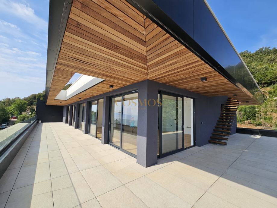 Prodaje se prostrani moderni 4,5-sobni stan u Opatiji, površine 238,01 m2koji se nalazi na etaži prizemlja i prvog kata te se sastoji od dva hodnika, wc-a, tri kupaonice,