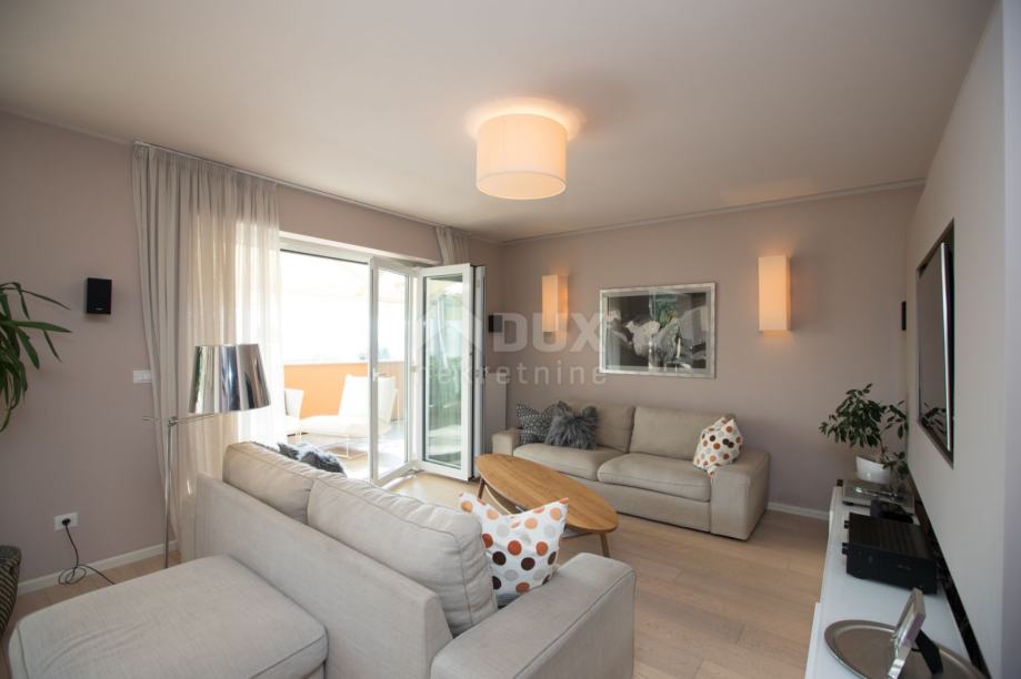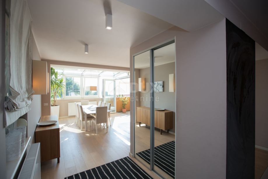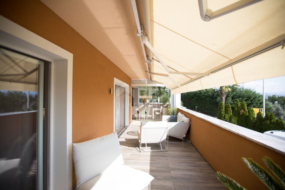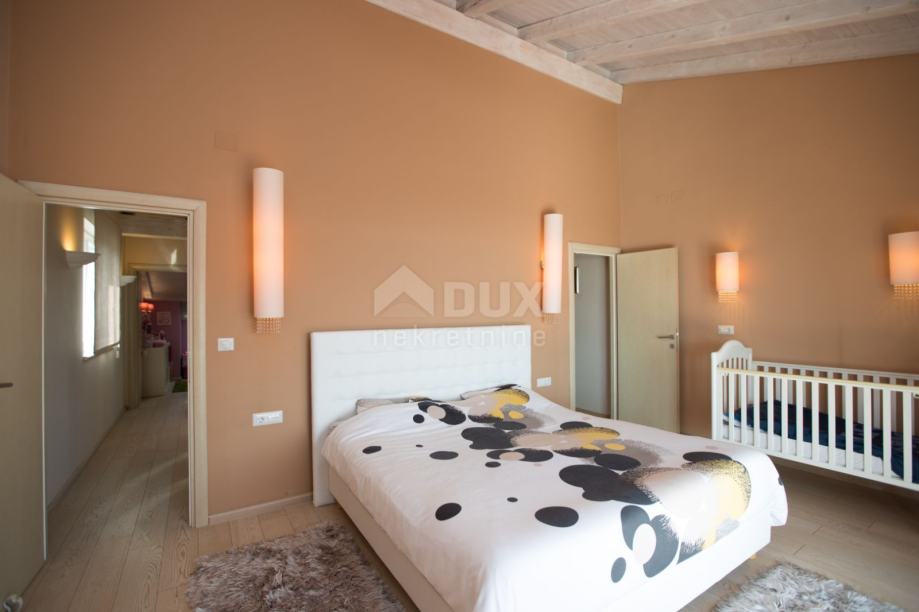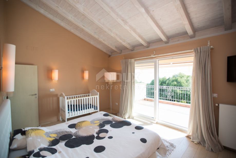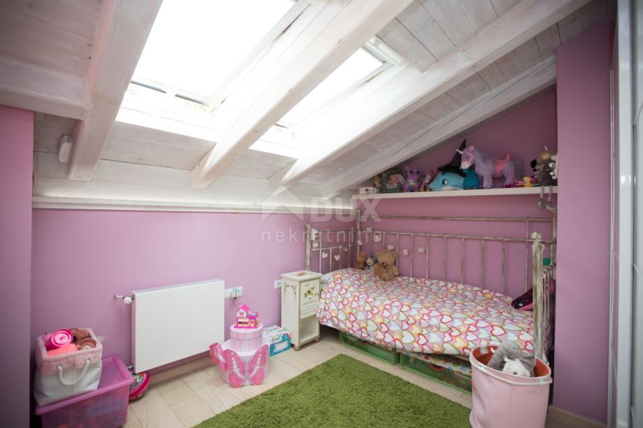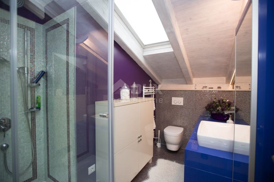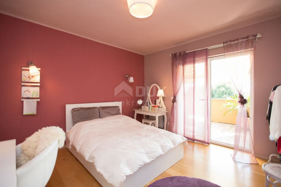Na gornjem dijelu stana nalaze se master soba s vlastitom kupaonicom i garderobom te prekrasnom terasom s pogledom na more te se nalazi jos jedna dječja spavaća soba.