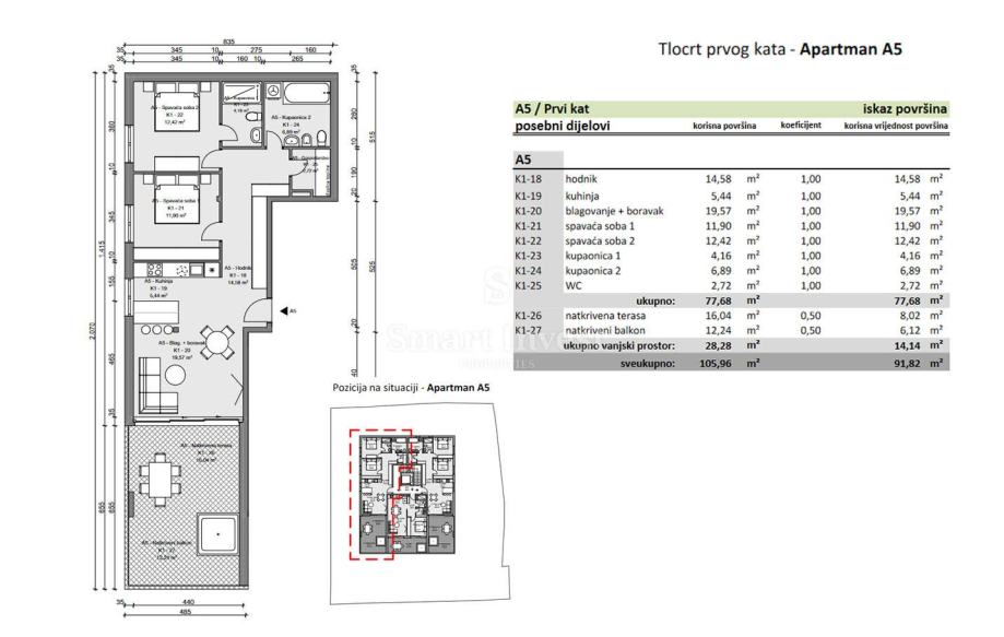 APARTMAN A5 se nalazi na 1. katu, sveukupna površina stana i pripadaka iznosi 108.23 m2.