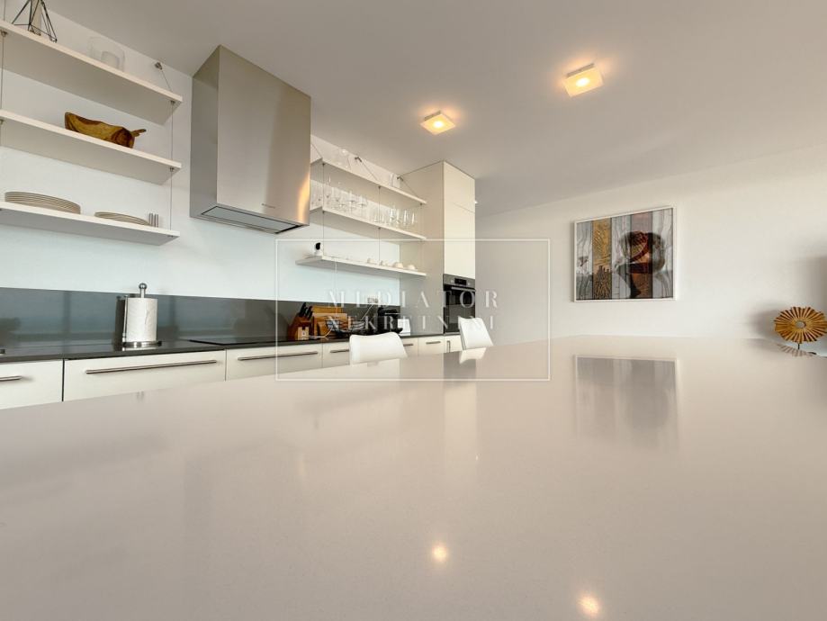 Kuhinja Scavolini izrađena je po mjeri i opremljena Bosch aparatima, a interijer je osmišljen s naglaskom na funkcionalnost, eleganciju i dugotrajnu kvalitetu. Stan se prodaje potpuno namješten, uključujući pažljivo biran namještaj renomiranih proizvođača te umjetnine iz kolekcije Yellow Corner. Nekretnina je korištena isključivo privatno i izuzetno rijetko, što je vidljivo u očuvanosti prostora.
