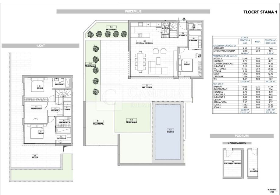 Stanu pripada ukupno 57 m2 podzemne garaže dovoljne za četiri automobila i spremište s direktnim pristupom liftom iz podzemne garaže.