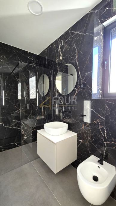 Opremljen je najmodernijim tehnologijama, uključujući podno grijanje i dizalicu topline, protuprovalna vrata, električne rolete te alarmni sustav za dodatnu sigurnost.