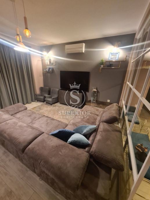 Stan se sastoji od prozračnog dnevnog boravka, dvije udobne spavaće sobe, potpuno opremljene kuhinje i blagovaonice, kupaonice i dodatnog WC-a. Svaka prostorija zrači toplinom doma, uz kvalitetan namještaj i pažljivo odabrane detalje – sve je spremno za useljenje.