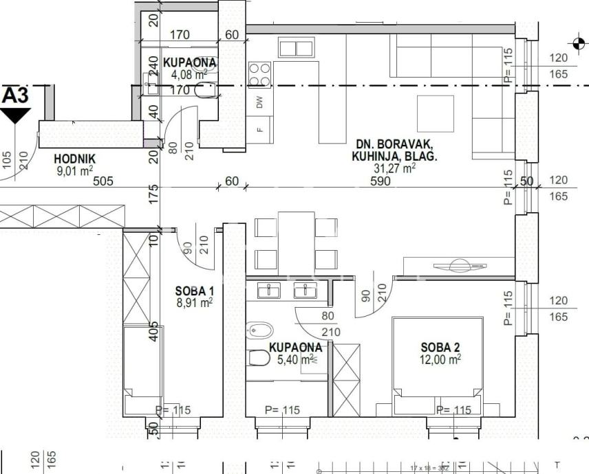 Stan se sastoji od dvije spavaće sobe, dnevnog boravka s kuhinjom i blagovaonicom te dvije kupaonice.