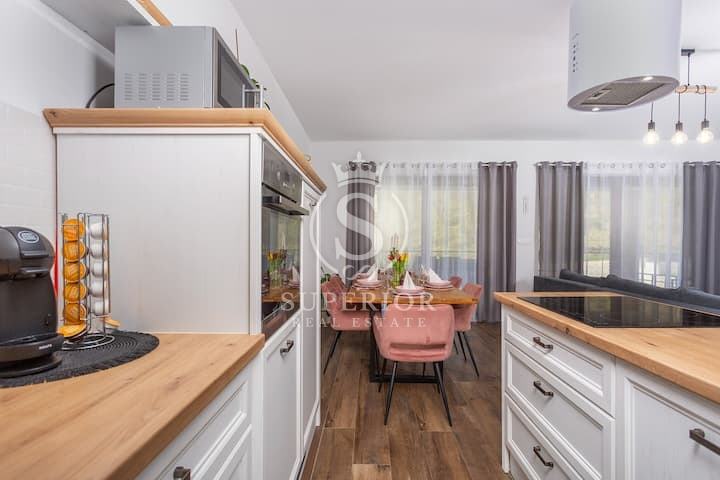 Interijer odiše stilom i skladom – svaki komad namještaja pažljivo je biran, a prirodna svjetlost unosi život u svaki kutak. Kombinacija toplih materijala i čistih linija stvara osjećaj ugode, profinjenosti i doma.