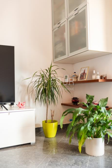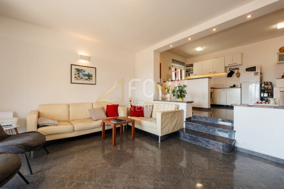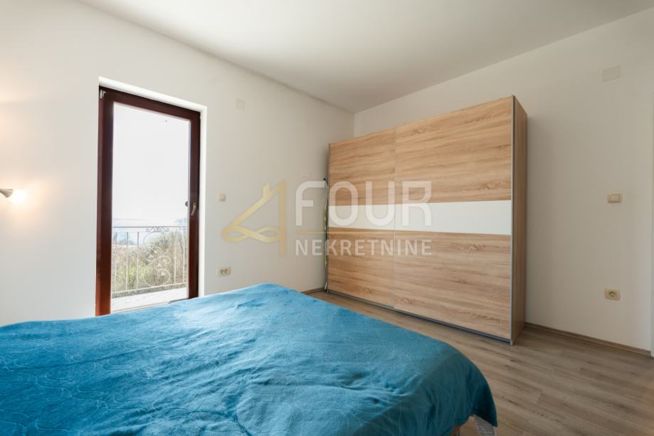 Na prvom katu smješten je prostrani stan s tri spavaće sobe, dnevnim boravkom, kuhinjom, blagovaonicom, dvije kupaonice, ostavom, balkonom i terasom s lijepim pogledom na Kvarnerski zaljev.