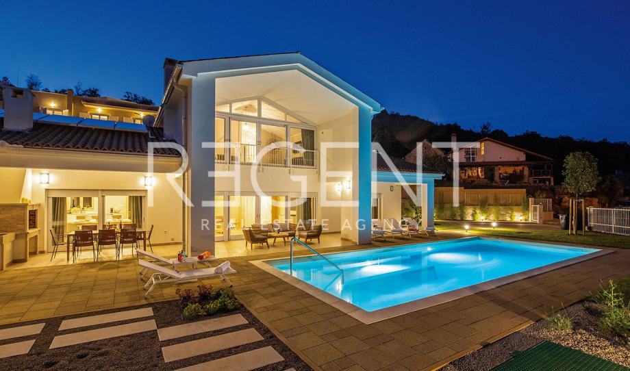Ova vila jedinstveni je spoj mora i planine. Nalazi se na mirnoj lokaciji, daleko od gradske buke. Ima privatnost i visok stupanj sigurnosti. Vila je okrenuta prema jugu, s pogledom na more i okolni arhipelag. Povezuje modernu arhitekturu, vrhunsku tehnologiju i luksuzni dizajn. Ovaj objekt je jedinstven zbog karakteristične arhitekture, ekološki prihvatljive gradnje, napredne tehnologije, solarnog grijanja te smještaja u prirodi, na granici Parka Prirode Učke.Vila se nalazi na parceli od 1034 m2, stambene površine od 400 m2. Prostire se na tri etaže s četiri spavaće sobe i četiri kupaonice. Kuhinja i blagovaonica spoj su modernog dizajna i funkcionalnosti, čineći prostor dovoljno toplim da se osjećate kao kod kuće. Interijer je namješten za potpuno opuštanje, posebnim odabirom boja i ulaskom svjetla. Vrhunsko opremljena kupaonica daje još jednu dimenziju spa ugođaju. Vanjska terasa i konoba savršena su mjesta za objedovanje i druženje. Grijani bazen mjesto je u kojem ćete moći uživati tijekom dana i tijekom večeri.Vila je kategorizirana s 5 zvjezdica, a nalazi se u Veprincu – drevnom gradiću iznad opatijske rivijere. Prema povijesnim nalazima, nastao je vjerojatno na temeljima pretpovijesne gradine, a porijeklo imena obično se dovodi u vezu s biljkom veprinom koja ovdje raste u izobilju. Veprinac krasi netaknuta priroda i ugodna klima.Za više informacija, kontaktirajte našeg agenta na brojeve telefona:
